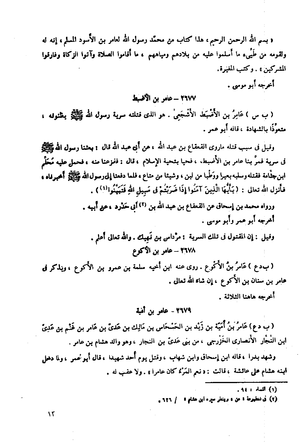 «بسم اللَّه الرحمن الرحيم، هذا كتاب من مُحَمَّد رَسُول اللَّهِ لعامر بْن الأسود المسلم، إنه له ولقومه من طيِّئ ما أسلموا عليه من بلادهم ومياههم، ما أقاموا الصلاة وآتوا الزكاة وفارقوا المشركين» . وكتب المغيرة.