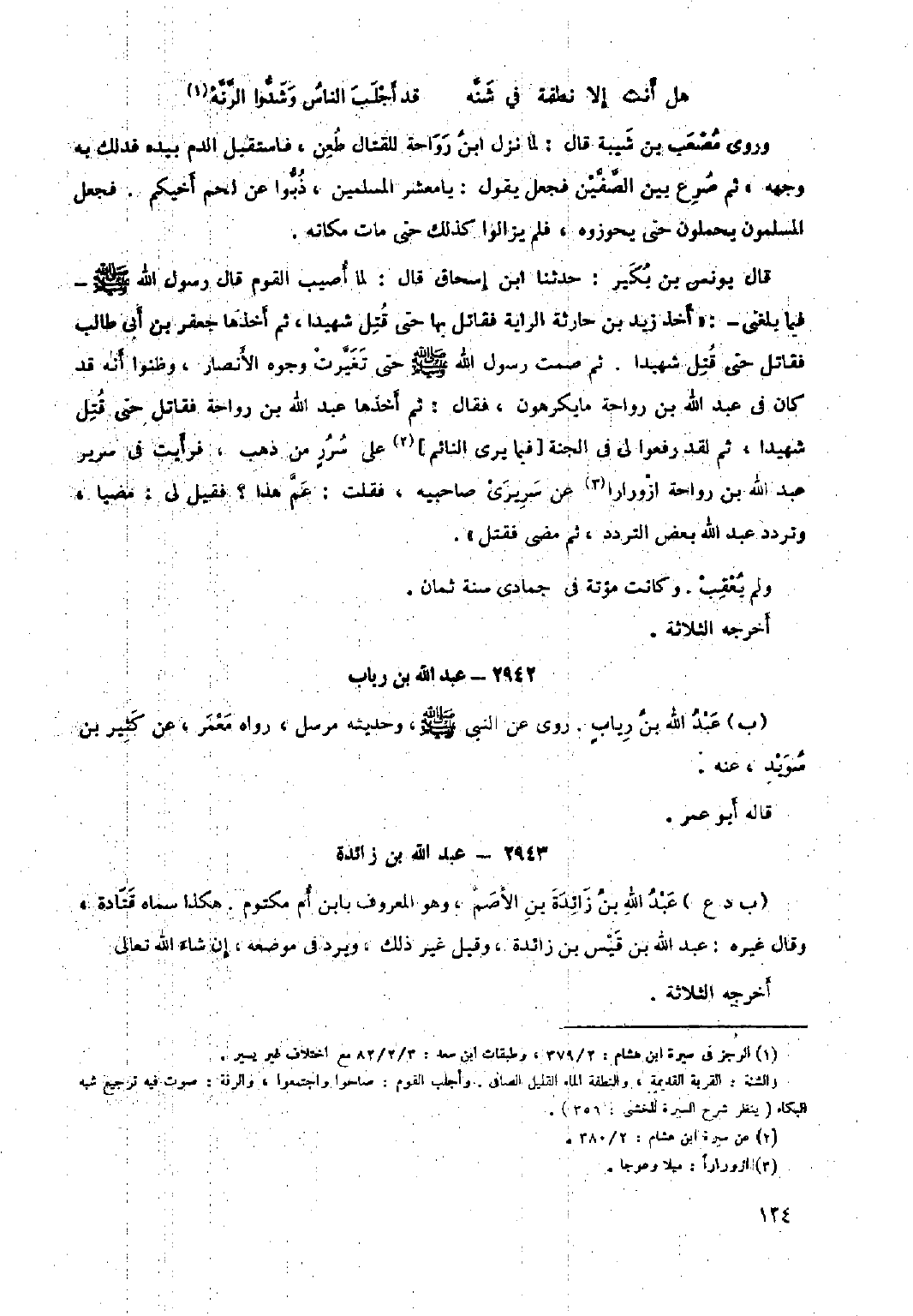 قال يونس بْن بكير: حدثنا ابن إِسْحَاق قال: لما أصيب القوم قال رَسُول اللَّهِ صَلَّى اللَّهُ عليه وسلم- فيما بلغني-: «أخذ زيد بْن حارثة الراية فقاتل بها حتى قتل شهيدًا، ثم أخذها جعفر بن أبي طالب فقاتل حتى قتل شهيدا. ثم صمت رَسُول اللَّهِ صَلَّى اللَّهُ عَلَيْهِ وَسَلَّمَ حتى تغيرت وجوه الأنصار، وظنوا أَنَّهُ قد كان في عَبْد اللَّهِ بْن رواحة ما يكرهون، فقال: ثم أخذها عَبْد اللَّهِ بْن رواحة فقاتل حتى قتل شهيدًا، ثم لقد رفعوا لي في الجنة [فيما يرى النائم] [٢] عَلَى سرر من ذهب، فرأيت في سرير عَبْد اللَّهِ بْن رواحة ازورارًا [٣] عَنْ سريري صاحبيه، فقلت: عم هذا؟ فقيل لي: مضيا، وتردد عَبْد اللَّهِ بعض التردد، ثم مضى فقتل» . ولم يعقب. وكانت مؤتة في جمادى سنة ثمان.
