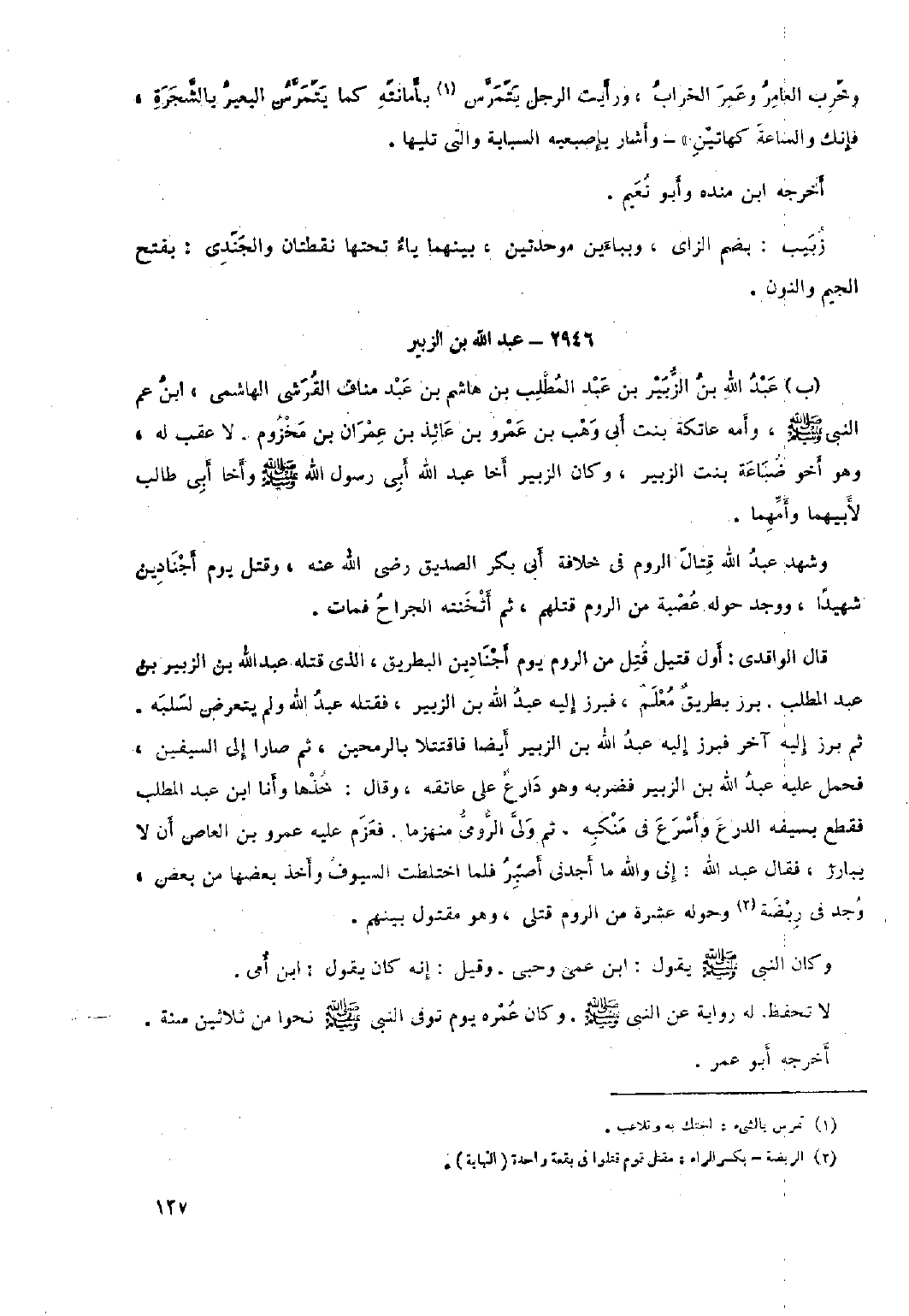 ثم برز إليه آخر فبرز إليه عَبْد اللَّهِ بْن الزبير أيضًا فاقتتلا بالرمحين، ثم صارا إِلَى السيفين، فحمل عليه عَبْد اللَّهِ بْن الزبير فضربه وهو دارع عَلَى عاتقه، وقال: خذها وأنا ابن عبد المطلب فقطع بسيفه الدرع وأسرع في منكبه، ثم ولى الرومي منهزمًا. فعزم عليه عمرو بْن العاص أن لا يبارز، فقال عَبْد اللَّهِ: إني والله ما أجدني أصبر فلما اختلطت السيوف وأخذ بعضها من بعض، وجد في ربضة [٢] وحوله عشرة من الروم قتلى، وهو مقتول بينهم.