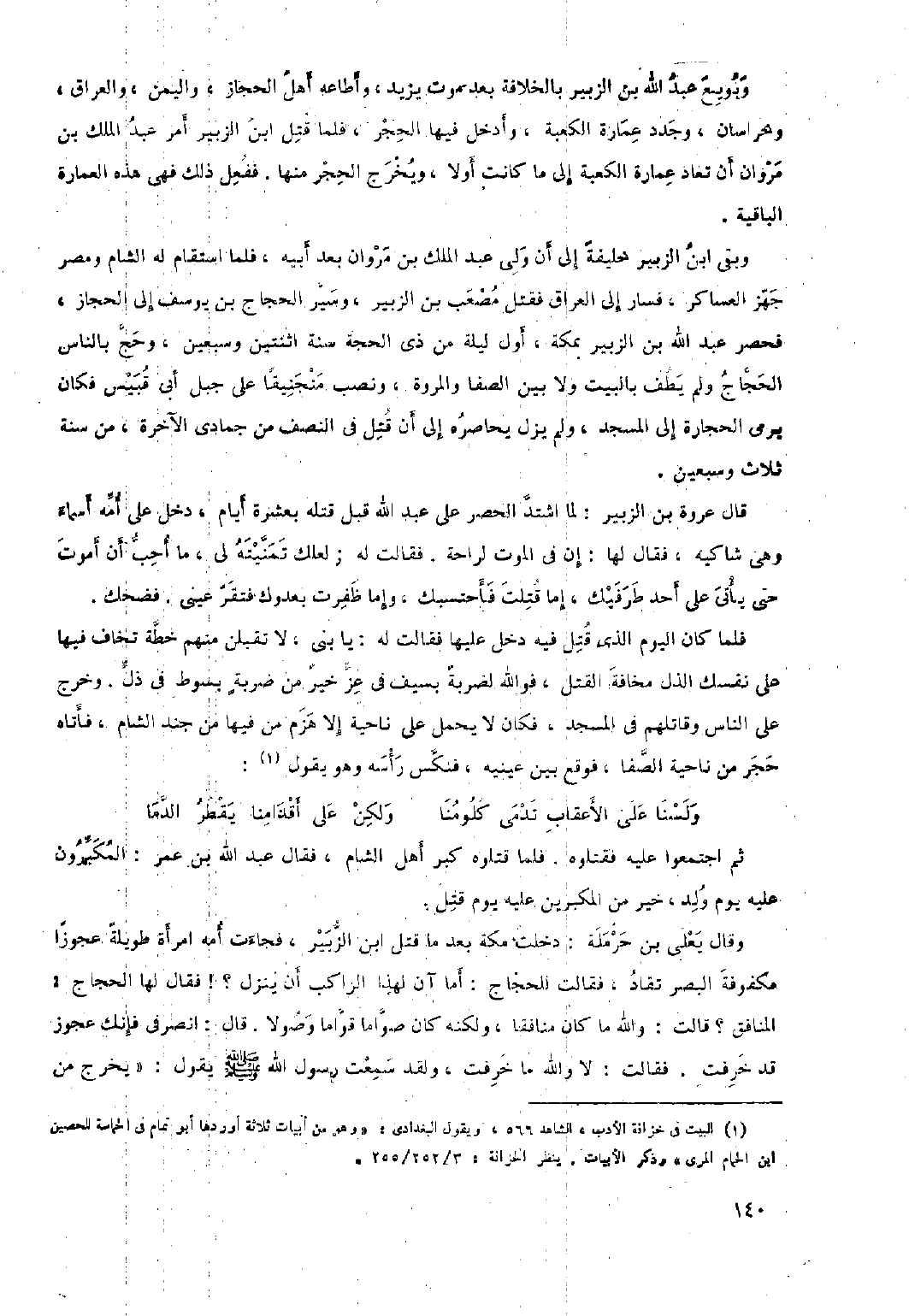 وبقي ابن الزبير خليفة إِلَى أن ولي عَبْد الْمَلِكِ بْن مروان بعد أبيه، فلما استقام له الشام ومصر جهز العساكر، فسار إِلَى العراق فقتل مصعب بْن الزبير، وسير الحجاج بْن يوسف إِلَى الحجاز، فحصر عَبْد اللَّهِ بْن الزبير بمكة، أول ليلة من ذي الحجة سنة اثنتين وسبعين، وحج بالناس الحجاج ولم يطف بالبيت ولا بين الصفا والمروة، ونصب منجنيقًا عَلَى جبل أَبِي قبيس فكان يرمي الحجارة إِلَى المسجد، ولم يزل يحاصره إِلَى أن قتل في النصف من جمادى الآخرة، من سنة ثلاث وسبعين.