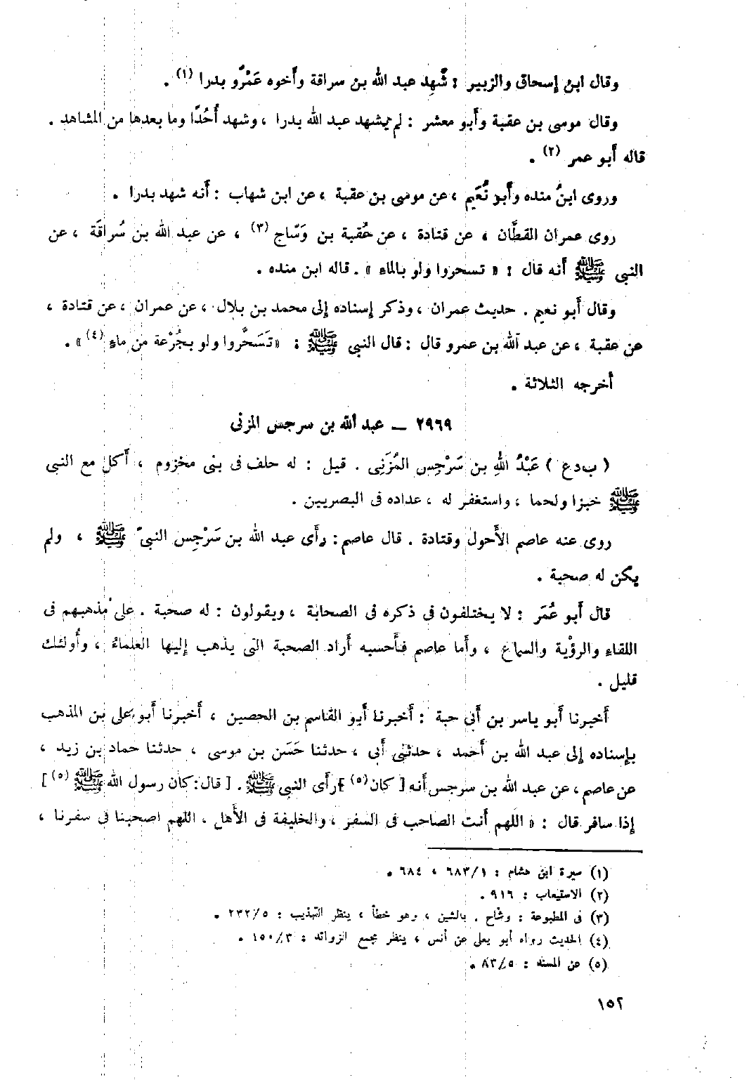 أَخْبَرَنَا أَبُو يَاسِرِ بْنُ أَبِي حَبَّةَ: أَخْبَرَنَا أَبُو الْقَاسِم بْن الحصين، أَخْبَرَنَا أَبُو عَلَى بْن المذهب بِإِسْنَادِهِ إِلَى عَبْد اللَّهِ بْن أَحْمَدَ، حَدَّثَنِي أبي، حدثنا حسن بن موسى، حدثنا حماد بْن زيد، عَنْ عاصم، عَنْ عَبْد اللَّهِ بْن سرجس أَنَّهُ [كان [٥]] رَأَى النَّبِيّ صَلَّى اللَّهُ عَلَيْهِ وَسَلَّمَ. [قَالَ: كان رَسُول الله صلى الله عليه وسلم [٥]] إذا سافر قال: «اللَّهمّ أنت الصاحب في السفر، والخليفة في الأهل، اللَّهمّ اصحبنا في سفرنا،