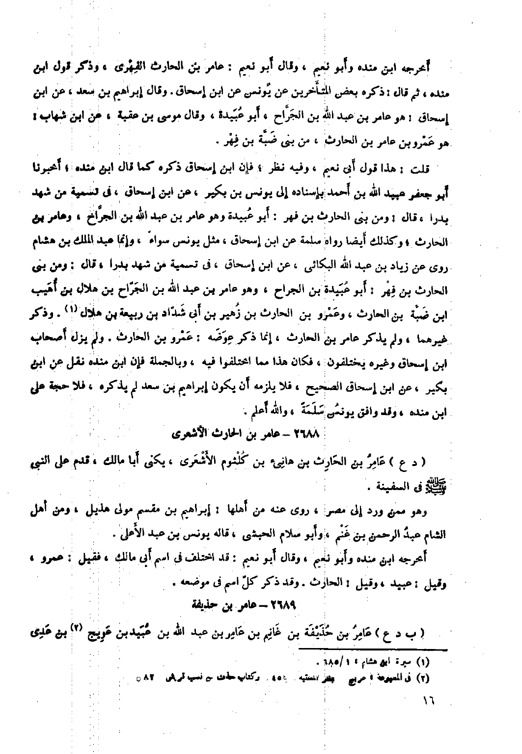 أخرجه ابن منده وَأَبُو نعيم، وقال أَبُو نعيم: عامر بْن الحارث الفهري، وذكر قول ابن منده، ثم قال: ذكره بعض المتأخرين عَنْ يونس عَنِ ابن إِسْحَاق. وقال إِبْرَاهِيم بْن سعد، عَنِ ابن إِسْحَاق: هو عامر بْن عَبْد اللَّهِ بْن الجراح، أَبُو عبيدة، وقال موسى بْن عقبة، عَنِ ابن شهاب: