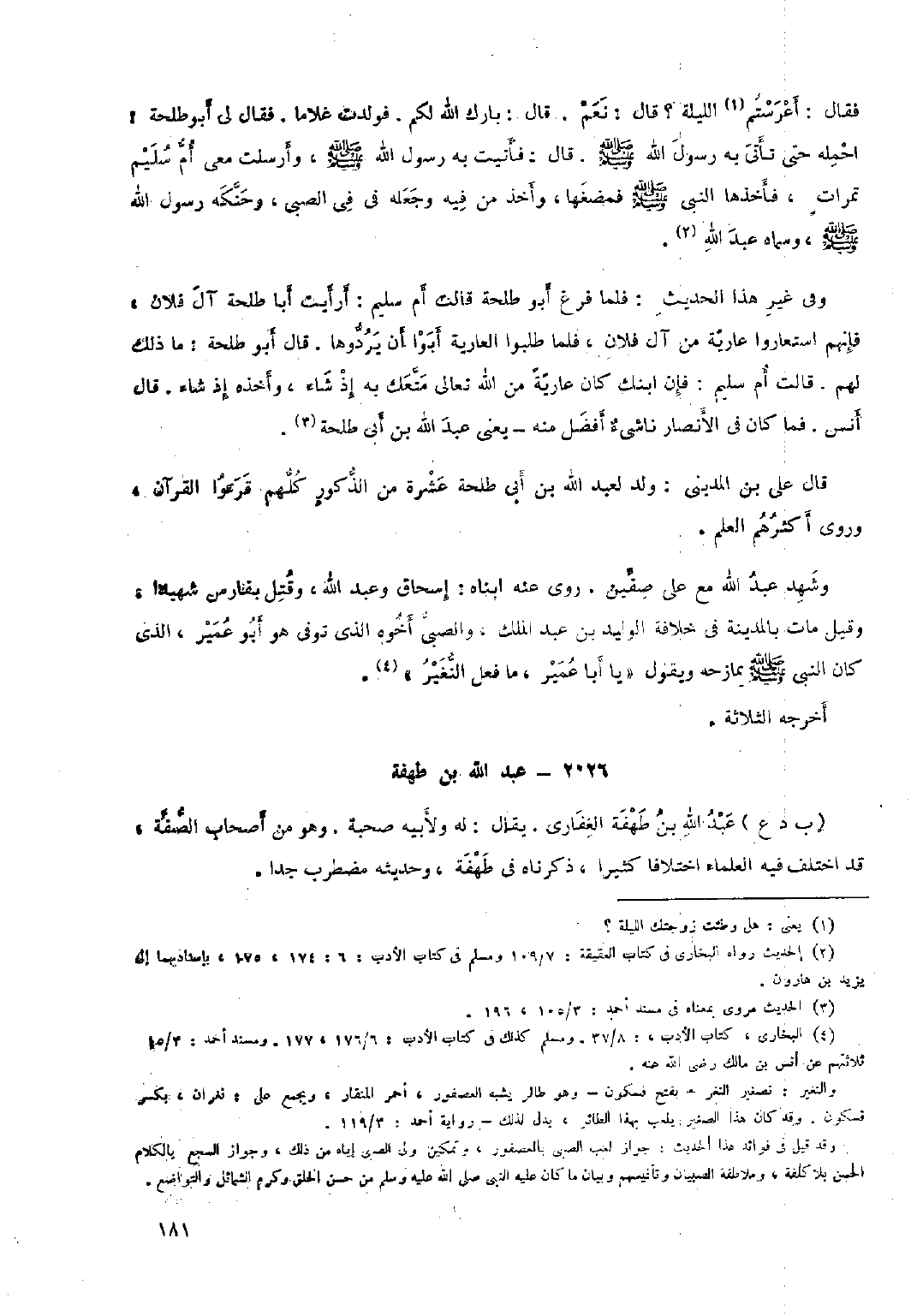 أحمله حتى تأتي به رَسُول اللَّهِ صَلَّى اللَّهُ عَلَيْهِ وَسَلَّمَ. قال: فَأَتَيْتُ بِهِ رَسُولَ اللَّهِ صَلَّى اللَّهُ عَلَيْهِ وَسَلَّمَ، وأرسلت معي أم سليم تمرات، فأخذها النَّبِيّ صَلَّى اللَّهُ عَلَيْهِ وَسَلَّمَ فمضغها، وأخذ من فيه وجعله في في الصبي، وحنكه رَسُول اللَّهِ صَلَّى اللَّهُ عَلَيْهِ وَسَلَّمَ، وسماه عَبْد اللَّهِ [٢] .