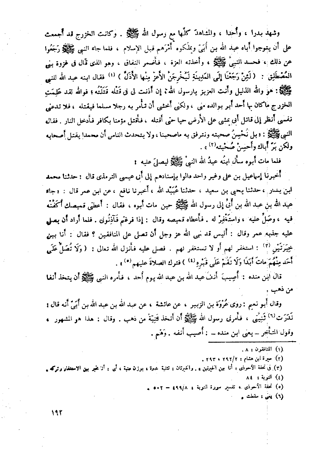 أَخْبَرَنَا إِسْمَاعِيلُ بْنُ عَلِيٍّ وَغَيْرُ وَاحِدٍ قَالُوا بِإِسْنَادِهِمْ إِلَى أَبِي عِيسَى التِّرْمِذِيِّ قال: حدثنا محمد ابن بَشَّارٍ، حَدَّثَنَا يَحْيَى بْنُ سَعِيدٍ، حَدَّثَنَا عُبَيْدُ اللَّهِ، أَخْبَرَنَا نَافِعٌ، عَنِ ابْنِ عُمَرَ قَالَ: «جاء عَبْد اللَّهِ بْن عَبْد اللَّهِ بْن أَبِي إلى رسول الله صلى الله عليه وسلم حِينَ مَاتَ أَبُوهُ، فَقَالَ: أَعْطِنِي قَمِيصَكَ أُكَفِّنْهُ فِيهِ، وَصَلِّ عَلَيْهِ، وَاسْتَغْفِرْ لَهُ. فَأَعْطَاهُ قَمِيصَهُ وَقَالَ: إِذَا فَرَغْتُمْ فَآذِنُونِي. فَلَمَّا أَرَادَ أَنْ يُصَلِّيَ عَلَيْهِ جَذَبَهُ عُمَرُ وَقَالَ: أَلَيْسَ قَدْ نَهَى اللَّهُ عَزَّ وَجَلَّ أَنْ تُصَلِّيَ عَلَى الْمُنَافِقِينَ؟ فَقَالَ: أَنَا بَيْنَ خَيْرَتَيْنِ [٣] : اسْتَغْفِرْ لَهُمْ أو لا تستغفر لهم. فَصَلَّى عَلَيْهِ فَأَنْزَلَ اللَّهُ تَعَالَى: وَلا تُصَلِّ عَلى أَحَدٍ مِنْهُمْ ماتَ أَبَداً وَلا تَقُمْ عَلى قَبْرِهِ ٩: ٨٤ [٤] فَتَرَكَ الصَّلاةَ عَلَيْهِمْ [٥] » . قَالَ ابْنُ منده: أُصيب أنف عَبْد اللَّه بْن عَبْد اللَّه يَوْم أحد، فأمره النَّبِيّ صَلَّى اللَّهُ عَلَيْهِ وَسَلَّمَ أن يتخذ أنفًا من ذهب.
