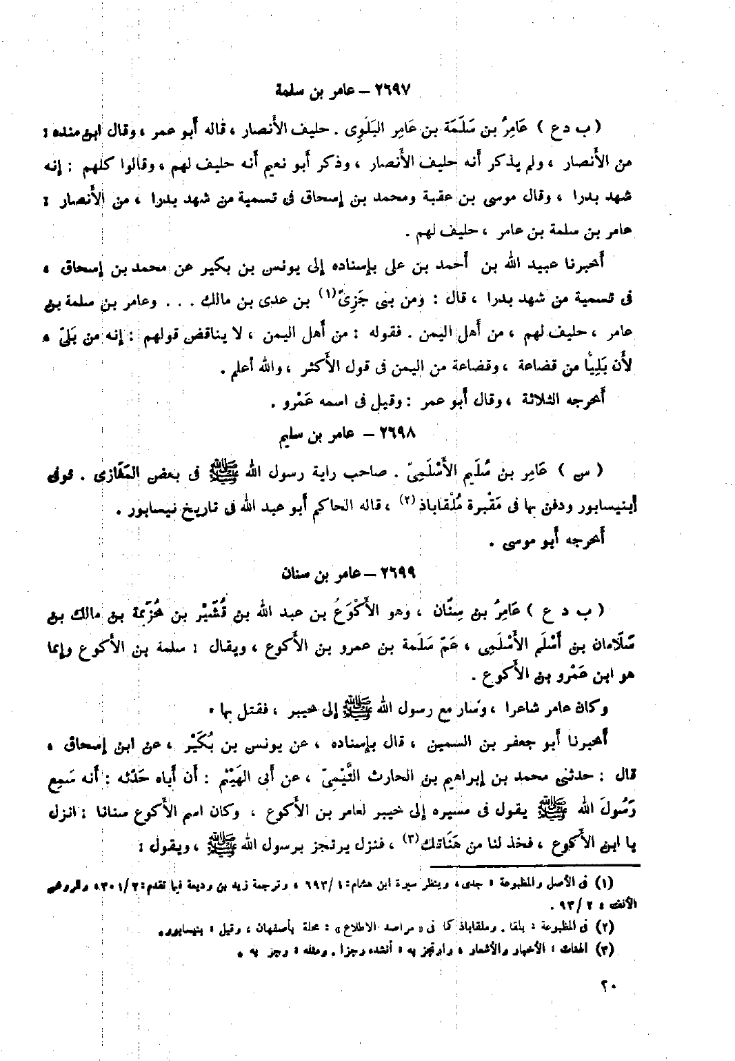 (ب د ع) عامر بْن سنان، وهو الأكوع بْن عَبْد اللَّهِ بْن قشير بْن خزيمة بْن مالك بْن سلامان بْن أسلم الأسلمي، عم سلمة بْن عمرو بْن الأكوع، ويقال: سلمة بْن الأكوع وَإِنما هو ابن عمرو بْن الأكوع.
