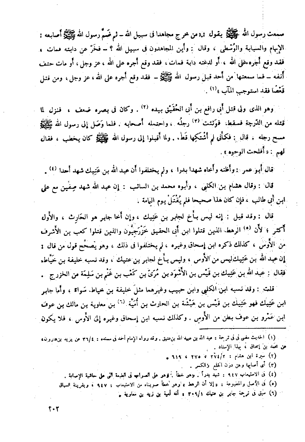قلت: وَقَدْ نسبه ابْنُ الكلبي وابن حبيب وغيرهما مثل خليفة بْن خياط، سواء، وأما جابر ابن عتيك فهو عتيك بْن قيس بْن هيشة بْن الحارث بْن أمية [٦] بْن معاوية بْن مالك بْن عوف ابن عَمْرو بْن عوف بطن من الأوس. وكذلك نسبه ابْنُ إِسْحَاق وغيره إلى الأوس، فلا يكون