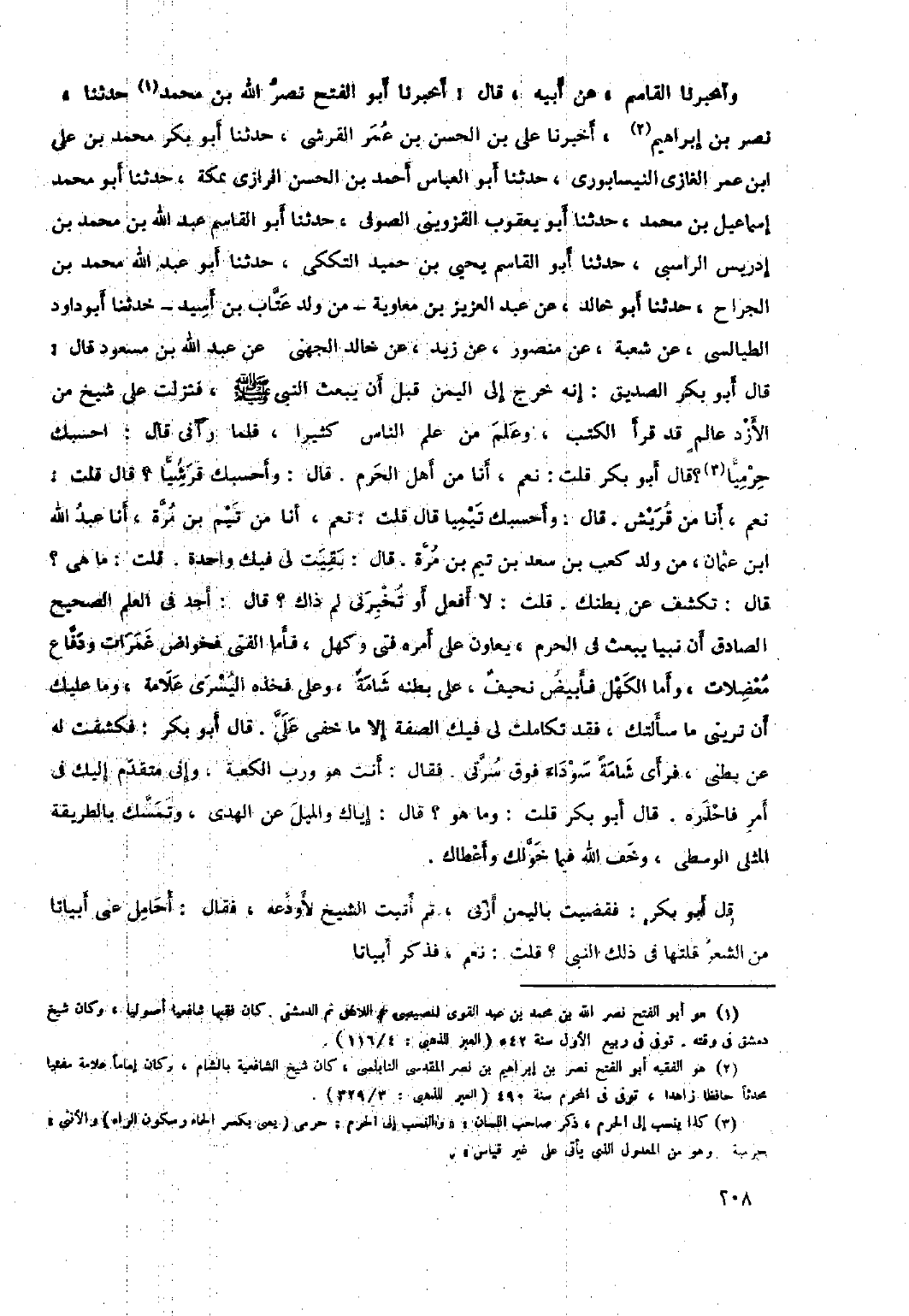 وَأَخْبَرَنَا الْقَاسِمُ، عَنْ أَبِيهِ، قَالَ: أَخْبَرَنَا أَبُو الْفَتْحِ نَصْرُ اللَّهِ بْنُ مُحَمَّدٍ [١] حَدَّثَنَا، نَصْرُ بن إبراهيم [٢] ، أخبرنا على بن الحسين بْنِ عُمَرَ الْقُرَشِيُّ، حَدَّثَنَا أَبُو بَكْرٍ مُحَمَّدُ بن على ابن عُمَرَ الْغَازِي النَّيْسَابُورِيُّ، حَدَّثَنَا أَبُو الْعَبَّاسِ أَحْمَدُ بْنُ الْحَسَنِ الرَّازِيُّ بِمَكَّةَ، حَدَّثَنَا أَبُو مُحَمَّدٍ إِسْمَاعِيلُ بْنُ مُحَمَّدٍ، حَدَّثَنَا أَبُو يَعْقُوبَ الْقَزْوِينِيُّ الصُّوفِيُّ، حَدَّثَنَا أَبُو الْقَاسِمِ عَبْدُ اللَّهِ بْنُ مُحَمَّدِ بْنِ إِدْرِيسَ الرَّاسِبِيُّ، حَدَّثَنَا أَبُو الْقَاسِمِ يَحْيَى بْنُ حُمَيْدٍ التِّكَكِيُّ، حَدَّثَنَا أَبُو عَبْدِ اللَّهِ مُحَمَّدُ بْنُ الْجَرَّاحِ، حَدَّثَنَا أَبُو خَالِدٍ، عن عبد العزيز بن معاوية- من ولد عَتَّابِ بْنِ أَسِيدٍ- حَدَّثَنَا أَبُو دَاوُدَ الطَّيَالِسِيُّ، عَنْ شُعْبَةَ، عَنْ مَنْصُورٍ، عَنْ زَيْدٍ، عَنْ خَالِدٍ الْجُهَنِيِّ عَنْ عَبْدِ اللَّهِ بْنِ مَسْعُودٍ قَالَ: