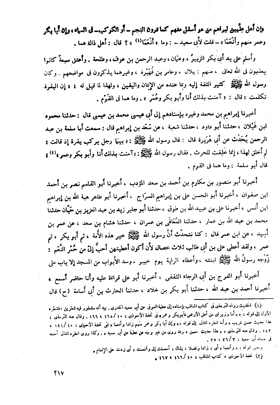 «إِنَّ أَهْلَ عِلِّييَن لَيَرَاهُمْ مَنْ هُوَ أَسْفَلُ منهم كما ترون النجم- أَوِ الْكَوَكْبَ- فِي السَّمَاءِ، وَإِنَّ أَبَا بَكْرٍ وَعُمَرَ مِنْهُمْ وَأَنْعَمَا» - قُلْتُ لأَبِي سَعِيدٍ-: وَمَا «أَنْعَمَا [١] » ؟ قَالَ: أَهْلُ ذَاكَ هُمَا. وأسلم عَلَى يد أَبِي بَكْر الزُّبَيْر، وعثمان، وعبد الرَّحْمَن بْن عوف، وطلحة. وأعتق سبعةً كانوا يعذبون فِي اللَّه تَعَالَى، منهم: بلال، وعامر بْنُ فهيرة، وغيرهما يذكرون فِي مواضعهم. وكان رَسُول اللَّه صَلَّى اللَّهُ عَلَيْهِ وَسَلَّمَ كَثِير الثقة إِلَيْه وبما عنده من الْإِيمَان واليقين، ولهذا لما قيل لَهُ: «إن البقرة تكلمت» قَالَ: «آمنت بذلك أَنَا وَأَبُو بَكْر وعمر» . وما هُماَ فِي القوم. أَخْبَرَنَا إِبْرَاهِيمُ بْنُ مُحَمَّدٍ وَغَيْرُهُ بِإِسْنَادِهِمْ إِلَى أَبِي عِيسَى مُحَمَّدِ بْنِ عِيسَى قَالَ: حَدَّثَنَا محمود ابن غَيْلانَ، حَدَّثَنَا أَبُو دَاوُدَ، حَدَّثَنَا شُعْبَةُ، عَنْ سَعْدِ بْنِ إِبْرَاهِيمَ قَالَ: سَمِعْتُ أَبَا سَلَمَةَ بْنَ عَبْدِ الرَّحْمَنِ يُحَدِّثُ عَنْ أَبِي هُرَيْرَةَ قَالَ: قَالَ رَسُولُ اللَّهِ صلى الله عليه وَسَلَّمَ: «بَيْنَمَا رَجُلٌ يَرْكَبُ بَقَرَةً إِذْ قَالَتْ: