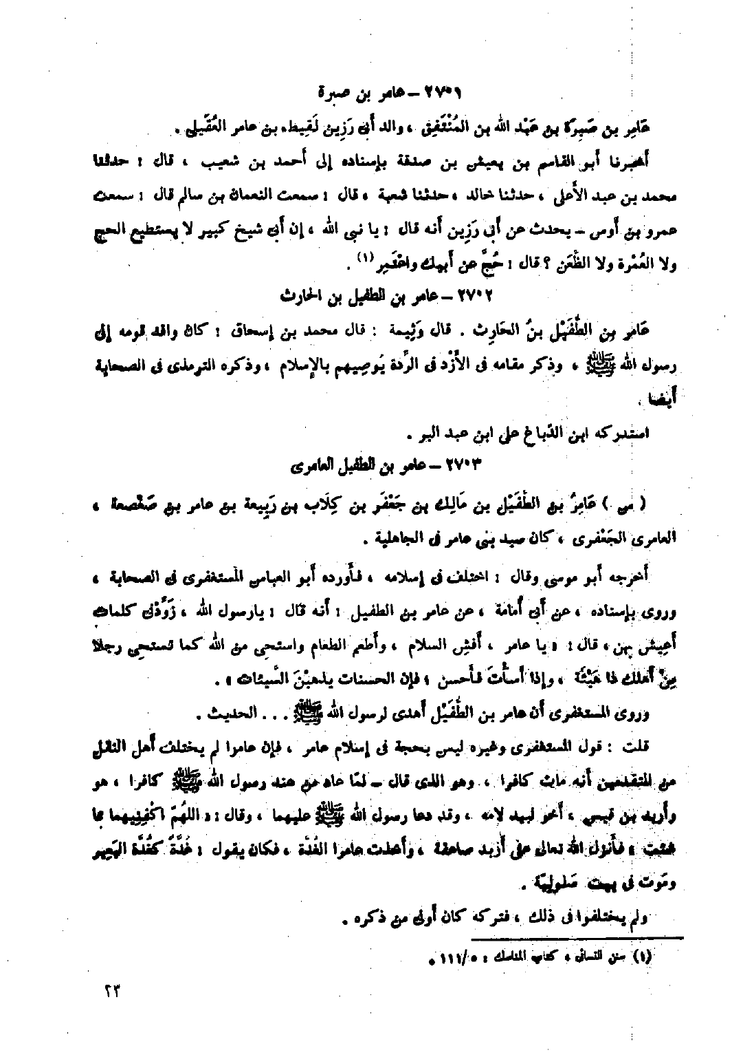 أخرجه أَبُو موسى وقال: اختلف في إسلامه، فأورده أَبُو العباس المستغفري في الصحابة، وروى بِإِسْنَادِهِ، عَنْ أَبِي أمامة، عَنْ عامر بْن الطفيل: أَنَّهُ قال: يا رَسُول اللَّهِ، زودني كلمات أعيش بهن، قال: «يا عامر، أفش السلام، وأطعم الطعام واستحي من الله كما تستحي رجلًا من أهلك ذا هيئة، وَإِذا أسأت فأحسن ف إِنَّ الْحَسَناتِ يُذْهِبْنَ السَّيِّئاتِ» . ١١: ١١٤ وروى المستغفري أن عامر بْن الطفيل أهدى لرسول اللَّه صَلَّى اللَّهُ عَلَيْهِ وَسَلَّمَ ... الحديث. قلت: قول المستغفري وغيره ليس بحجة في إسلام عامر، فإن عامرًا لم يختلف أهل النقل من المتقدمين أَنَّهُ مات كافرًا، وهو الذي قال- لما عاد من عند رَسُول اللَّهِ صَلَّى اللَّهُ عَلَيْهِ وَسَلَّمَ كافرًا، هو وأربد بْن قيس، أخو لبيد لأمه، وقد دعا رَسُول اللَّهِ صَلَّى اللَّهُ عَلَيْهِ وَسَلَّمَ عليهما، وقال: «اللَّهمّ اكفنيهما بما شئت» فأنزل اللَّه تعالى عَلَى أربد صاعقة، واتخذت عامرًا الغدة، فكان يقول: غدة كغدة البعير وموت فِي بيت سلولية. ولم يختلفوا في ذلك، فتركه كان أولى من ذكره.