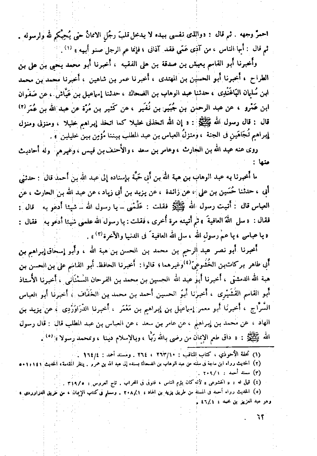 «يا عباس، يا عم رَسُول اللَّهِ، سل اللَّه العافية في الدنيا والآخرة [٣] » . أَخْبَرَنَا أَبُو نَصْرٍ عَبْدُ الرَّحِيمِ بْنُ مُحَمَّدِ بْنِ الحسن بْن هبة اللَّه، وَأَبُو إِسْحَاق إِبْرَاهِيم بْن أَبِي طاهر بركات بْن الخشوعي [٤] وَغَيْرُهُمَا، قَالُوا: أَخْبَرَنَا الْحَافِظُ. أَبُو الْقَاسِمِ عَلِيُّ بن الحسن بن هبة اللَّه الدمشقي، أَخْبَرَنَا أَبُو عَبْد اللَّهِ الحسين بْن مُحَمَّدِ بْنِ الفرحان السمناني، أَخْبَرَنَا الأستاذ أَبُو الْقَاسِم القشيري، أَخْبَرَنَا أَبُو الْحُسَيْنُ أَحْمَدُ بْنُ مُحَمَّدِ بْنِ الخفاف، أَخْبَرَنَا أَبُو العباس السَّرَّاجُ، أَخْبَرَنَا أَبُو مَعْمَرٍ إِسْمَاعِيلُ بْنُ إِبْرَاهِيمَ بْن معمر، أَخْبَرَنَا الدراوردي، عَنْ يَزِيدَ بْنِ الْهَادِ، عَنْ مُحَمَّدِ بْنِ إِبْرَاهِيم، عَنْ عامر بْن سعد، عَنْ العباس بْن عبد المطلب قال: قال رسول الله صلى الله عليه وَسَلَّمَ: «ذاق طعم الإيمان من رضي باللَّه ربّا، وبالإسلام دينا، وبمحمد رسولا» [٥] .
