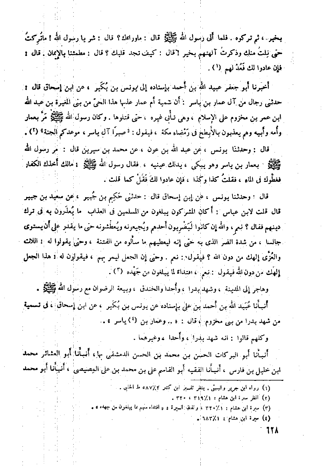 حَدَّثَنِي رِجَالٌ مِنْ آلِ عَمَّارِ بْنِ يَاسِرٍ: أَنَّ سُمَيَّةَ أُمَّ عَمَّارٍ عَذَّبَهَا هَذَا الْحَيُّ من بني المغيرة بن عبد الله ابن عُمَرَ بْنِ مَخْزُومٍ عَلَى الإِسْلامِ، وَهِيَ تَأْبَى غَيْرَهُ، حَتَّى قَتَلُوهَا. وَكَانَ رَسُولُ اللَّهِ صَلَّى اللَّهُ عَلَيْهِ وَسَلَّمَ مَرَّ بِعَمَّارٍ وَأُمِّهِ وَأَبِيهِ وَهُمْ يُعَذَّبُونَ بِالأَبْطَحِ فِي رَمْضَاءِ مَكَّةَ، فَيَقُولُ: «صَبْرًا آلَ يَاسِرٍ، مَوْعِدُكُمُ الْجَنَّةُ» [٢] . قَالَ: وَحَدَّثَنَا يُونُسُ، عَنْ عَبْدِ اللَّهِ بْنِ عَوْنٍ، عَنْ مُحَمَّدِ بْنِ سِيرِينَ قَالَ: مَرَّ رَسُول اللَّهِ صَلَّى اللَّهُ عَلَيْهِ وَسَلَّمَ بِعَمَّارِ بْنِ يَاسِرٍ وَهُوَ يَبْكِي، يُدَلِّكُ عَيْنَيْهِ، فَقَالَ رَسُولُ اللَّهِ صلى الله عليه وسلم: مالك أَخَذَكَ الْكُفَّارُ فَغَطَّوْكَ فِي الْمَاءِ، فَقُلْتُ كَذَا وَكَذَا، فَإِنْ عَادُوا لَكَ فَقُلْ كَمَا قُلْتَ. قال: وحدثنا يونس، عَنِ ابن إِسْحَاق قال: حَدَّثَنِي حَكِيمُ بْنُ جُبَيْرٍ، عَنْ سَعِيدِ بْنِ جُبَيْرٍ قَالَ قُلْتُ لابْنِ عَبَّاسٍ: أَكَانَ الْمُشْرِكُونَ يَبْلُغُونَ مِنَ الْمُسْلِمِينَ فِي الْعَذَابِ مَا يُعَذَّرُونَ بِهِ فِي تَرْكِ دِينِهِمْ فَقَالَ؟ نَعَمْ، وَاللَّهِ إِنْ كَانُوا لَيَضْرِبُونَ أَحَدَهُمْ وَيُجِيعُونَهُ وَيُعَطِّشُونَهُ حَتَّى مَا يَقْدِرُ عَلَى أَنْ يَسْتَوِيَ جَالِسًا، مِنْ شِدَّةِ الضُّرِّ الَّذِي بِهِ حَتَّى إِنَّهُ لَيُعْطِيهِمْ مَا سَأَلُوهُ مِنَ الْفِتْنَةِ، وَحَتَّى يَقُولُوا لَهُ: اللاتُ وَالْعُزَّى إِلَهُكَ مِنْ دُونِ اللَّهِ؟ فَيَقُولُ: نَعَمْ. وَحَتَّى إِنَّ الْجُعَلَ لَيَمُرُّ بِهِمْ، فَيَقُولُونَ لَهُ: هَذَا الْجُعَلُ إِلَهُكَ مِنْ دُونِ اللَّهِ فيقول: نعم، اقتداء لِمَا يَبْلُغُونَ مِنْ جُهْدِهِ [٣] .