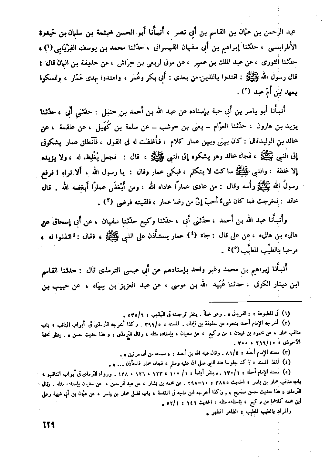 قَالَ رَسُولُ اللَّهِ صَلَّى اللَّهُ عَلَيْهِ وَسَلَّمَ: اقْتَدُوا بِالَّذِينَ مِنْ بَعْدِي: أَبِي بَكْرٍ وَعُمَرَ، وَاهْتَدُوا بِهَدْيِ عَمَّارٍ، وَتَمَسَّكُوا بِعَهْدِ ابْنِ أُمِّ عَبْدٍ [٢] . أَنْبَأَنَا أَبُو يَاسِرِ بْنُ أَبِي حَبَّةَ بِإِسْنَادِهِ عن عبد الله بن أحمد بن حنبل: حَدَّثَنِي أَبِي، حَدَّثَنَا يَزِيدُ بْنُ هَارُونَ، حَدَّثَنَا الْعَوَّامُ- يَعْنِيَ بن حَوْشَبٍ- عَنْ سَلَمَةَ بْنِ كُهَيْلٍ، عَنْ عَلْقَمَةَ، عَنْ خَالِدِ بْنِ الْوَلِيدِ قَالَ: كَانَ بَيْنِي وَبَيْنَ عَمَّارٍ كَلامٌ، فَأَغْلَظْتُ لَهُ فِي الْقَوْلِ، فَانْطَلَقَ عَمَّارٌ يَشْكُونِي إِلَى النَّبِيِّ صَلَّى اللَّهُ عَلَيْهِ وَسَلَّمَ، فَجَاءَ خَالِدٌ وَهُوَ يَشْكُوهُ إِلَى النَّبِيِّ صَلَّى اللَّهُ عَلَيْهِ وَسَلَّمَ، قَالَ: فَجَعَل يُغَلِّظُ لَهُ، وَلا يَزِيدُهُ إِلا غِلْظَةً، وَالنَّبِيُّ صَلَّى اللَّهُ عَلَيْهِ وَسَلَّمَ سَاكِتٌ لا يَتَكَلَّمُ، فَبَكَى عَمَّارٌ وَقَالَ: يَا رَسُولَ اللَّهِ، أَلا تَرَاهُ! فَرَفَعَ رَسُول اللَّهِ صَلَّى اللَّهُ عَلَيْهِ وَسَلَّمَ رَأْسَهُ وَقَالَ: مَنْ عَادَى عَمَّارًا عَادَاهُ اللَّهُ، وَمَنْ أَبْغَضَ عَمَّارًا أَبْغَضَهُ اللَّهُ. قَالَ خَالِدٌ: فَخَرَجْتُ فَمَا كَانَ شَيْءٌ أَحَبَّ إِلَيَّ مِنْ رِضَا عَمَّارٍ، فَلَقِيتُهُ فَرَضِيَ [٣] . وَأَنْبَأَنَا عَبْدُ الله بن أحمد، حدثني أبي، حدثنا وكيع حَدَّثَنَا سُفْيَانُ، عَنْ أَبِي إِسْحَاقَ عَنْ هَانِئِ بْنِ هَانِئٍ، عَنْ عَلِيٍّ قَالَ: جَاءَ [٤] عَمَّارٌ يَسْتَأْذِنُ عَلَى النَّبِيِّ صَلَّى اللَّهُ عَلَيْهِ وَسَلَّمَ، فَقَالَ: «ائْذَنْوُا لَهُ، مَرْحَبًا بِالطَّيِّبِ الْمُطَيَّبِ [٥] » . أَنْبَأَنَا إِبْرَاهِيمُ بْنُ مُحَمَّدٍ وَغَيْرُ وَاحِدٍ بِإِسْنَادِهِمْ عَنْ أَبِي عِيسَى التِّرْمِذِيِّ قال: حدثنا القاسم ابن دِينَارٍ الْكُوفِيُّ، حَدَّثَنَا عُبَيْدُ اللَّهِ بْنُ مُوسَى، عَنْ عَبْدِ الْعَزِيزِ بْنِ سِيَاهٍ، عَنْ حَبِيبِ بن
