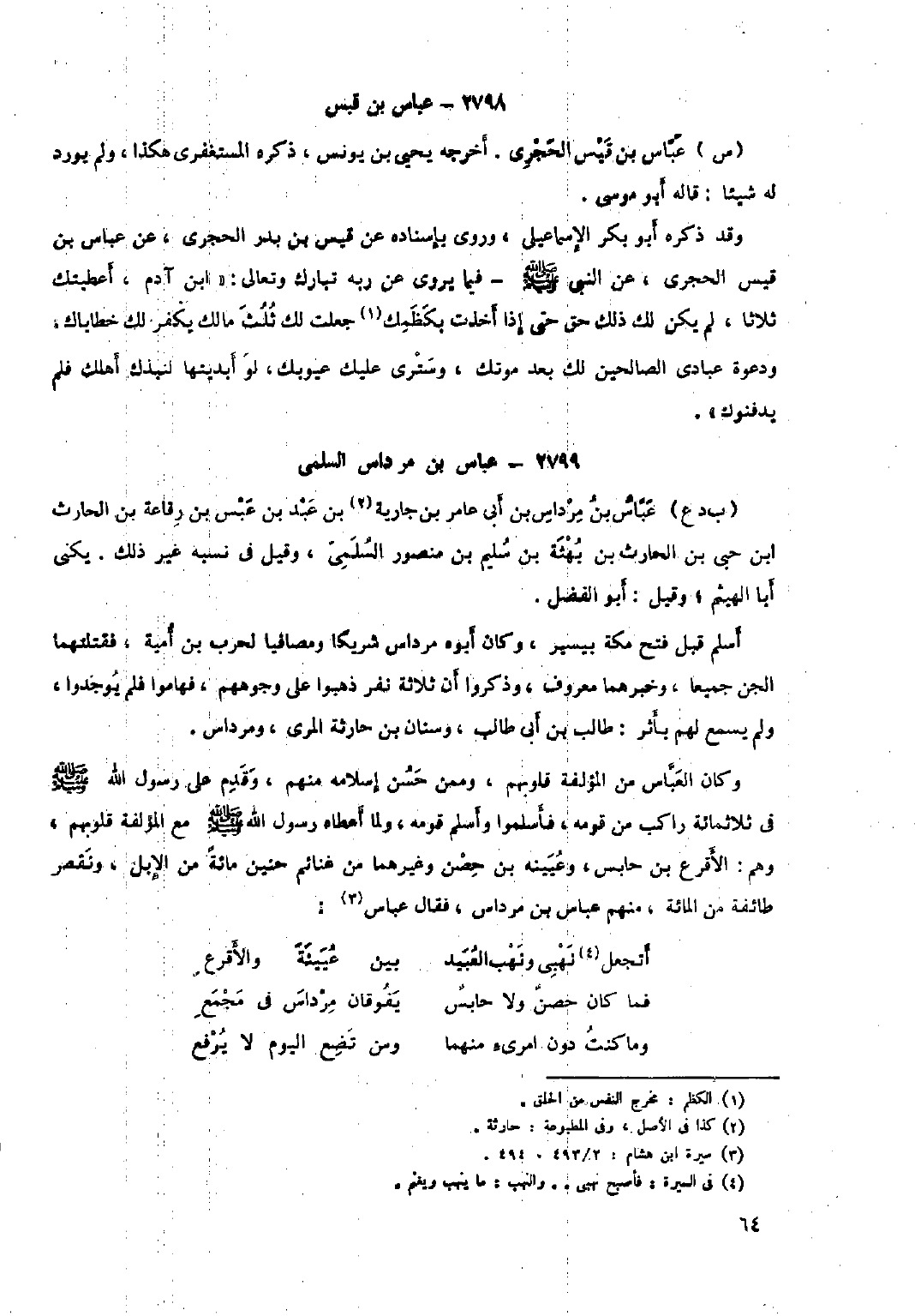 وكان العباس من المؤلفة قلوبهم، وممن حسن إسلامه منهم، وقدم عَلَى رَسُول اللَّهِ صَلَّى اللَّهُ عَلَيْهِ وَسَلَّمَ في ثلاثمائة راكب من قومه، فأسلموا وأسلم قومه، ولما أعطاه رَسُول اللَّهِ صَلَّى اللَّهُ عَلَيْهِ وَسَلَّمَ مع المؤلفة قلوبهم، وهم: الأقرع بْن حابس، وعيينة بْن حصن وغيرهما من غنائم حنين مائة من الإبل، ونقص طائفة من المائة، منهم عباس بْن مرداس، فقال عباس [٣] :