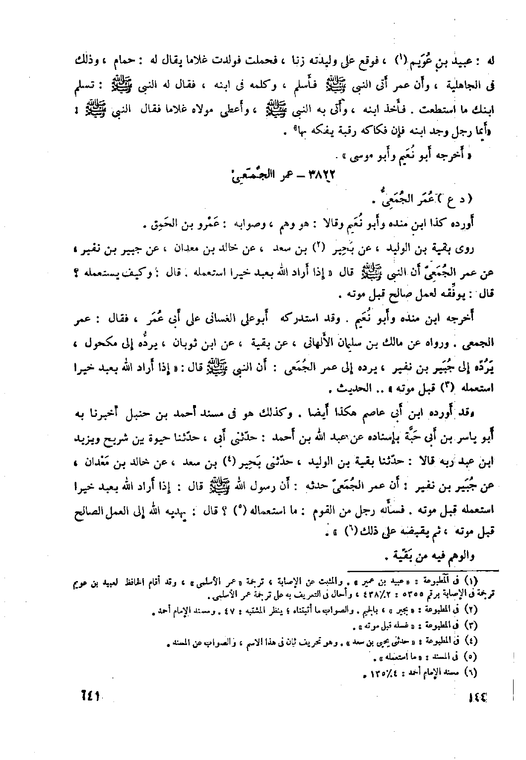 وَقَدْ أَوْرَدَهُ ابْنُ أَبِي عَاصِمٍ هَكَذَا أَيْضًا. وَكَذَلِكَ هُوَ فِي مُسْنَدِ أَحْمَدَ بْنِ حَنْبَلٍ أَخْبَرَنَا بِهِ أَبُو يَاسِرِ بْنُ أَبِي حَبَّةَ بِإِسْنَادِهِ عن عبد الله بن أحمد: حَدَّثَنِي أَبِي، حَدَّثَنَا حَيْوَةُ بْنُ شُرَيْحٍ وَيَزِيدُ ابن عَبْدِ رَبِّهِ قَالا: حَدَّثَنَا بَقِيَّةُ بْنُ الْوَلِيدِ، حَدَّثَنِي بَحِيرُ [٤] بْنُ سَعْدٍ، عَنْ خَالِدِ بْنِ مَعْدَانَ، عَنْ جُبَيْرِ بْنِ نُفَيْرٍ: أَنَّ عُمَرَ الْجُمَعِيَّ حَدَّثَهُ: أَنَّ رَسُولَ اللَّهِ صَلَّى اللَّهُ عَلَيْهِ وَسَلَّمَ قَالَ: إِذَا أَرَادَ اللَّهُ بِعَبْدٍ خَيْرًا اسْتَعْمَلَهُ قَبْلَ مَوْتِهِ. فَسَأَلَهُ رَجُلٌ مِنَ الْقَوْمِ: مَا اسْتِعْمَالُهُ [٥] ؟ قَالَ: يَهْدِيهِ اللَّهُ إِلَى الْعَمَلِ الصَّالِحِ قَبْلَ مَوْتِهِ، ثُمَّ يَقْبِضُهُ عَلَى ذلك [٦] » . والوهم فيه من بقيّة.