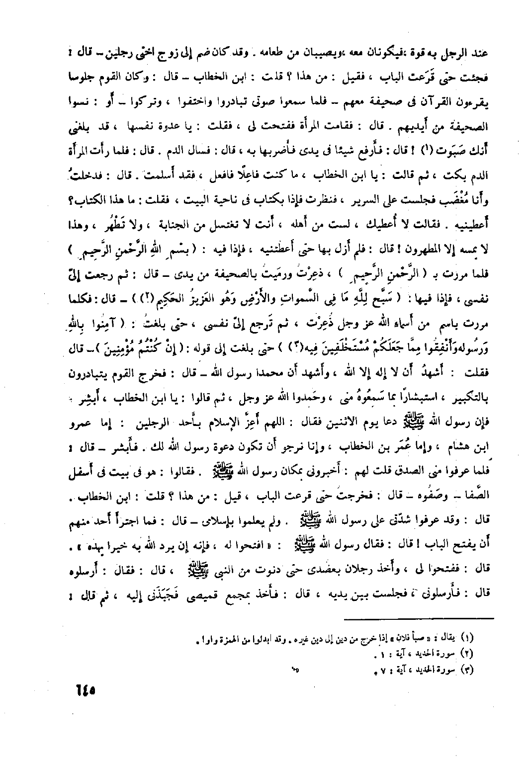 أَعْطِينِيهِ. فَقَالَتْ لا أُعْطِيكَ، لَسْتَ مِنْ أَهْلِهِ، أَنْتَ لا تَغْتَسِلُ مِنَ الْجَنَابَةِ، وَلا تَطْهُرُ، وَهَذَا لا يَمَسُّهُ إِلا الْمُطَهَّرُونَ! قَالَ: فَلَمْ أَزَلْ بِهَا حَتَّى أَعْطَتْنِيهِ، فَإِذَا فِيهِ: بِسْمِ اللَّهِ الرَّحْمنِ الرَّحِيمِ ١: ١ فَلَمَّا مررت ب الرَّحْمنِ الرَّحِيمِ ١: ٣، ذعرت ورميت بالصحيفة مِنْ يَدِي- قَالَ: ثُمَّ رَجَعْتُ إِلَى نَفْسِي، فإذا فيها: سَبَّحَ لِلَّهِ ما في السَّماواتِ وَالْأَرْضِ وَهُوَ الْعَزِيزُ الْحَكِيمُ ٥٧: ١ [٢]- قَالَ: فَكُلَّمَا مَرَرْتُ بِاسْمٍ مِنْ أَسْمَاءِ اللَّهِ عَزَّ وَجَلَّ ذَعَرْتُ، ثُمَّ تَرْجِعُ إِلَيَّ نَفْسِي، حَتَّى بَلَغْتُ: آمِنُوا بِاللَّهِ وَرَسُولِهِ وَأَنْفِقُوا مِمَّا جَعَلَكُمْ مُسْتَخْلَفِينَ فِيهِ ٥٧: ٧ [٣] حتَّى بَلَغْتُ إِلَى قَوْلِهِ: إِنْ كُنْتُمْ مُؤْمِنِينَ ٥٧: ٨- قَالَ فَقُلْتُ: أَشْهَدُ أَنْ لا إِلَهَ إِلا اللَّهُ، وَأَشْهَدُ أَنَّ مُحَمَّدًا رَسُولُ اللَّهِ- قَالَ: فَخَرَجَ الْقَوْمُ يَتَبَادَرُونَ بِالتَّكْبِيرِ، اسْتِبْشَارًا بِمَا سَمِعُوهُ مِنِّي، وَحَمِدُوا اللَّهَ عَزَّ وَجَلَّ، ثُمَّ قَالُوا: يا ابن الْخَطَّابِ، أَبْشِرْ، فَإِنَّ رَسُولَ اللَّهِ صَلَّى اللَّهُ عَلَيْهِ وَسَلَّمَ دَعَا يَوْمَ الإِثْنَيْنِ فَقَالَ: اللَّهمّ أعزّ الإسلام بأحد الرجلين: إما عمرو ابن هِشَامٍ، وَإِمَّا عُمَرَ بْنِ الْخَطَّابِ، وَإِنَّا نَرْجُو أن تكون دعوة رسول الله لَكَ. فَأَبْشِرْ- قَالَ: