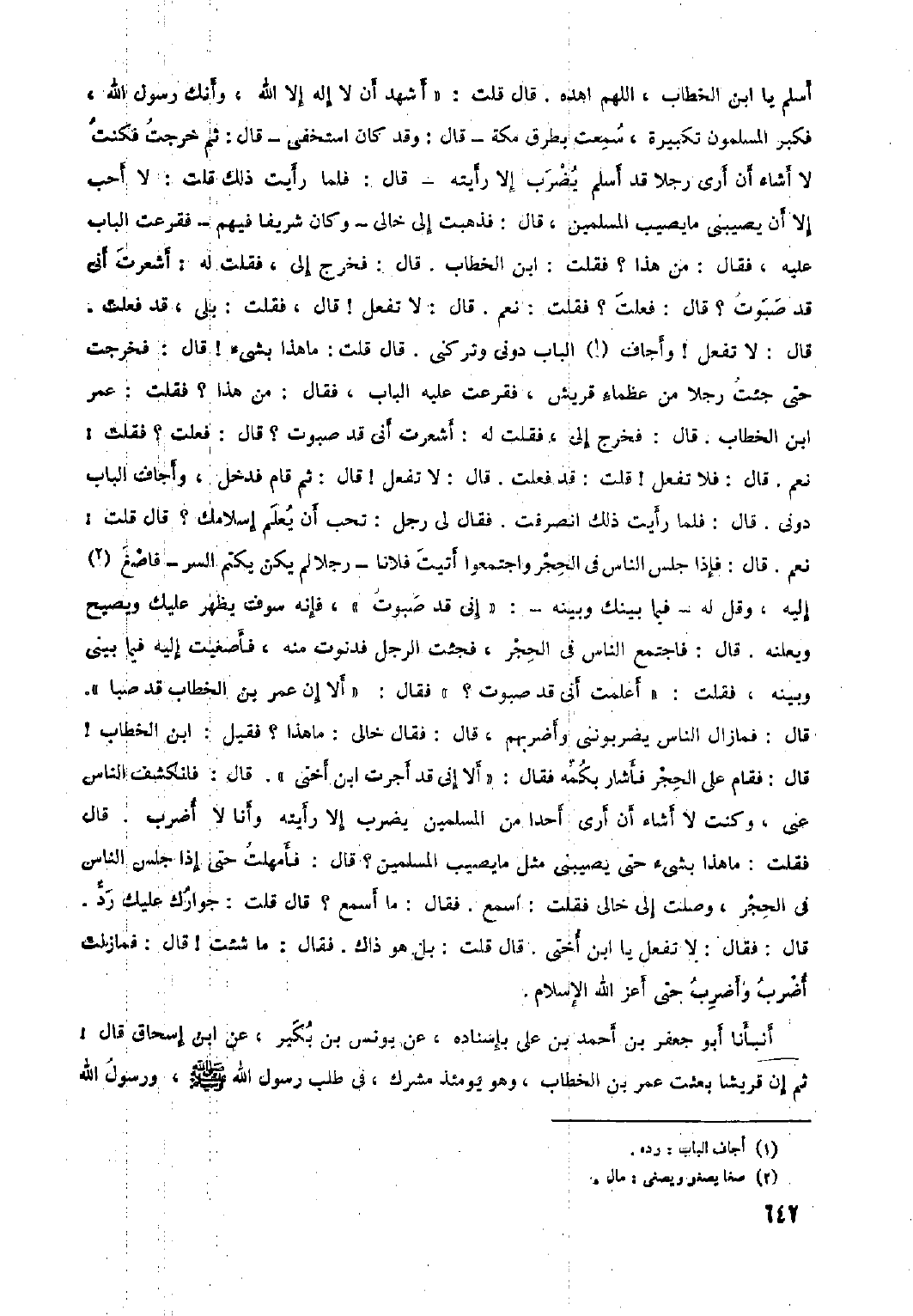 أَعْمَدُ إِلَى مُحَمَّدٍ الَّذِي سَفَّهَ أَحْلامَ قُرَيْشٍ، وَشَتَمَ آلْهِتَهُمْ، وَخَالَفَ جَمَاعَتَهُمْ. فَقَالَ النَّحَّامُ: وَاللَّهِ لَبِئْسَ الْمَمْشَى مَشَيْتَ يَا عُمَرُ! وَلَقَدْ فَرَّطْتَ وَأَرَدْتَ هَلَكَةَ عَدِيِّ بْنِ كَعْبٍ! أَوْ تُرَاكَ تَفَلْتَ مِنْ بَنِي هَاشِمٍ وَبَنِي زُهْرَةَ وَقَدْ قَتَلَتْ مُحَمَّدًا؟ فَتَحَاوَرَا حَتَّى ارْتَفَعَتْ أَصْوَاتُهُمَا، فَقَالَ لَهُ عُمَرُ: إِنِّي لأَظُنُّكَ قَدْ صَبَوْتَ، وَلَوْ أَعْلَمُ ذَلِكَ لَبَدَأْتُ بِكَ! فَلَمَّا رَأَى النَّحَّامُ أَنَّهُ غَيْرُ مُنْتَهٍ قَالَ: فَإِنِّي أُخْبِرُكَ أَنَّ أَهْلَكَ وَأَهْلَ خَتْنِكَ قَدْ أَسْلَمُوا، وَتَرَكُوكَ وَمَا أَنْتَ عَلَيْهِ مِنْ ضَلالَتِكَ. فَلَمَّا سَمِعَ عُمَرُ تلك يقولها قَالَ: وَأَيُّهُمْ؟ قَالَ: خَتَنُكَ وَابْنُ عَمِّكَ [١] وَأُخْتُكَ. فَانْطَلَقَ عُمَرُ حَتَّى أَتَى أُخْتَهُ، وَكَانَ رَسُولُ اللَّهِ صَلَّى اللَّهُ عَلَيْهِ وَسَلَّمَ إِذَا أَتَتْهُ طَائِفَةٌ مِنْ أَصْحَابِهِ مِنْ ذَوِي الْحَاجَةِ، نَظَرَ إِلَى أُولِي السَّعَةِ، فَيَقُولُ: عِنْدَكَ فُلانٌ. فَوَافَقَ ذَلِكَ ابْنَ عَمِّ عُمَرَ وَخَتْنَهُ- زَوْجَ أُخْتِهِ- سعيد بن زيد بن عمرو بن نفيل، فَدَفَعَ إِلَيْه رَسُولُ اللَّهِ صَلَّى اللَّهُ عَلَيْهِ وَسَلَّمَ خَبَّابَ بْنَ الأَرَتِّ، وَقَدْ أنَزْلَ اللَّهُ تعالى: طه. ما أَنْزَلْنا عَلَيْكَ الْقُرْآنَ لِتَشْقى ٢٠: ١- ٢ [٢] .