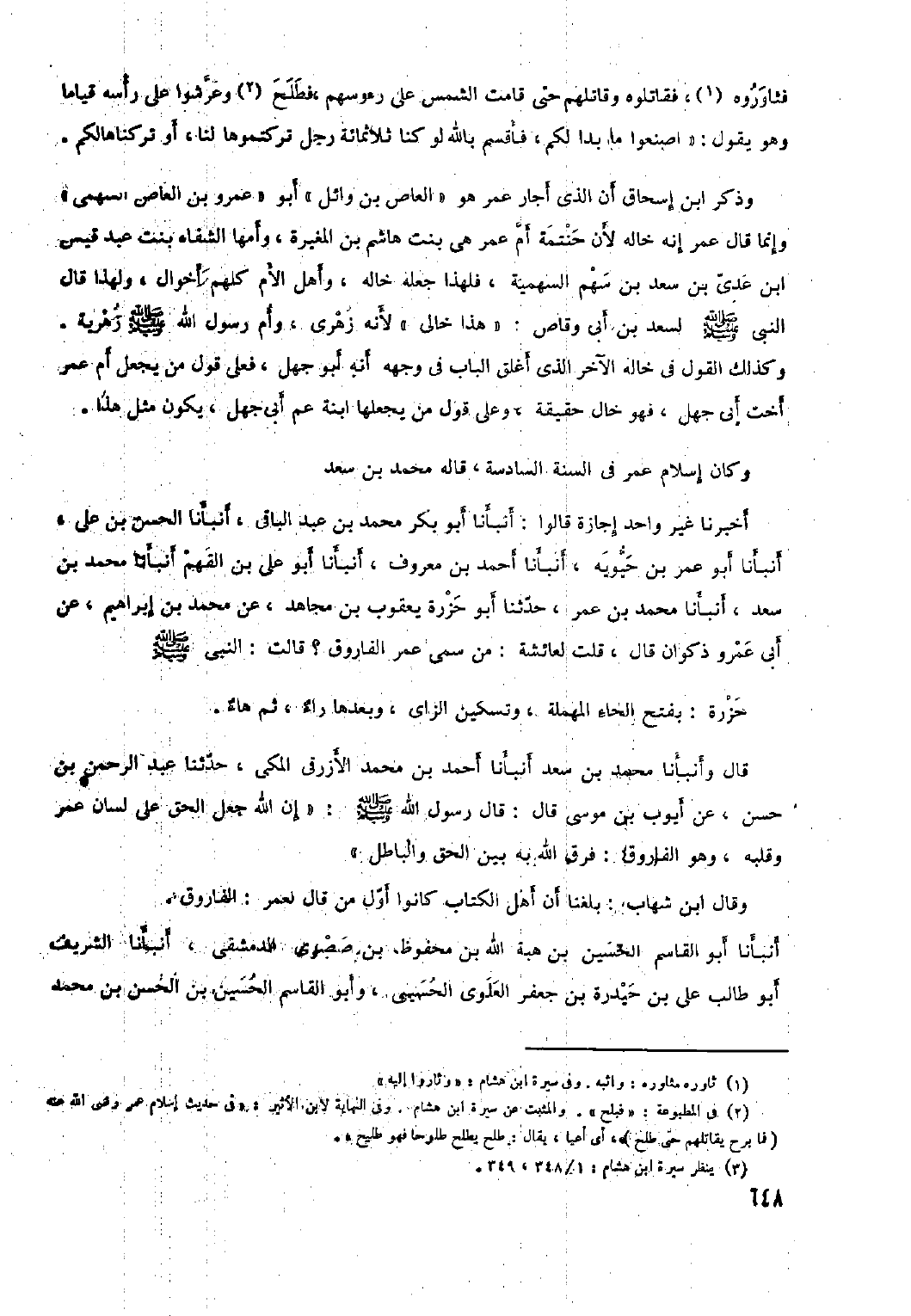 وكذلك القول في خاله الآخر الَّذِي أغلق الباب فِي وجهه أَنَّهُ أبو جهل، فعلى قول من يجعل أم عُمَر أخت أَبِي جهل، فهو خال حقيقة، وعلى قول من يجعلها ابْنَة عم أَبِي جهل، يكون مثل هَذَا. [٣] وكان إسلام عُمَر فِي السنة السادسة، قاله مُحَمَّد بْن سعد أَخْبَرَنَا غَيْرُ وَاحِدٍ إِجَازَةً قَالُوا: أَنْبَأَنَا أَبُو بَكْرٍ مُحَمَّدُ بْنُ عَبْدِ الْبَاقِي، أَنْبَأَنَا الْحَسَنُ بْنُ عَلِيٍّ، أَنْبَأَنَا أَبُو عُمَرَ بْنُ حَيُّوَيْهِ، أَنْبَأَنَا أَحْمَدُ بْنُ مَعْرُوفٍ، أَنْبَأَنَا أَبُو عَلِيِّ بْنُ الْقَهْمِ أَنْبَأَنَا مُحَمَّدُ بْنُ سَعْدٍ، أنبأنا محمد بن عمر، حدّثنا أبو حرزة يَعْقُوبُ بْنُ مُجَاهِدٍ، عَنْ مُحَمَّدِ بْنِ إِبْرَاهِيمَ، عَنْ أَبِي عَمْرٍو ذَكْوَانَ قَالَ، قُلْتُ لِعَائِشَةَ: مَنْ سَمَّى عُمَرَ الْفَارُوقَ؟ قَالَتْ: النَّبِيُّ صَلَّى اللَّهُ عَلَيْهِ وَسَلَّمَ حزرة: بفتح الحاء المهملة، وتسكين الزاي، وبعدها راء، ثُمَّ هاء.