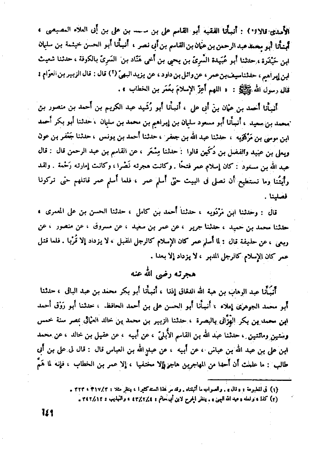 أَنْبَأَنَا عَبْدُ الْوَهَّابِ بْنُ هِبَةِ اللَّهِ الدَّقَّاقُ إِذْنًا، أَنْبَأَنَا أَبُو بَكْرٍ مُحَمَّدُ بْنُ عَبْدِ الْبَاقِي، حَدَّثَنَا أَبُو مُحَمَّدٍ الْجَوْهَرِيُّ إِمْلاءً، أَنْبَأَنَا أَبُو الْحَسَنِ عَلِيُّ بْنُ أَحْمَدَ الْحَافِظُ، حَدَّثَنَا أَبُو روق أحمد ابن مُحَمَّدِ بْنِ بَكْرٍ الْهِزَّانِيُّ بِالْبَصْرَةِ، حَدَّثَنَا الزُّبَيْرُ بْنُ مُحَمَّدِ بْنِ خَالِدٍ الْعُثْمَانِيُّ بِمِصْرَ سَنَةَ خَمْسٍ وَسِتِّينَ وَمِائَتَيْنِ، حَدَّثَنَا عَبْدُ اللَّهِ بْنُ الْقَاسِمِ الأَبُلِّيُّ، عَنْ أَبِيهِ، عَنْ عَقِيلِ بْنِ خالد، عن محمد ابن عَلِيِّ بْنِ عَبْد اللَّهِ بْن عَبَّاسٍ، عَنِ أَبِيهِ، عَنْ عَبْدِ اللَّهِ بْنِ الْعَبَّاسِ قَالَ: قَالَ لِي عَلِيُّ بْنُ أَبِي طَالِبٍ: مَا عَلِمْتُ أَنَّ أَحَدًا مِنَ الْمُهَاجِرِينَ هَاجَرَ إِلا مُخْتَفِيًا، إِلا عُمَرَ بْنَ الْخَطَّابِ، فَإِنَّهُ لَمَّا همّ