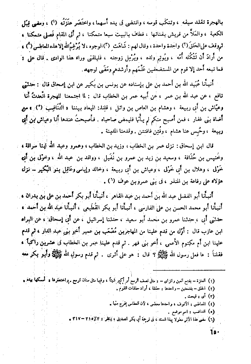 فَمَا تَبِعَهُ أَحَدٌ إِلا قَوْمٌ مِنَ الْمُسْتَضْعَفِينَ عَلِمَهُمْ وَأَرْشَدَهُمْ وَمَضَى لِوَجْهِهِ. أَنْبَأَنَا عبيد الله بن أحمد بن عَليّ بإسناده عن يونس بن بكير عن ابن إسحاق قَالَ: حَدَّثَنِي نَافِعٌ، عَنْ عَبْدِ اللَّهِ بْنِ عُمَرَ، عَنْ أَبِيهِ عُمَرَ بْنِ الْخَطَّابِ قَالَ: لَمَّا اجْتَمَعْنَا لِلْهِجْرَةِ اتَّعَدْتُ أَنَا وَعَيَّاشُ بْنُ أَبِي رَبِيعَةَ، وَهِشَامُ بْنُ الْعَاصِ بْنِ وَائِلٍ، قُلْنَا: الْمِيعَادُ بَيْنَنَا «التَّنَاضِبُ [٥] » مِنْ أَضَاةِ بَنِي غِفَارٍ، فَمَنْ أَصْبَحَ مِنْكُمْ لَمْ يَأْتِهَا فَلْيَمْضِ صَاحِبَاهُ. فَأَصْبَحْتُ عِنْدَهَا أَنَا وَعَيَّاشُ بْنُ أَبِي رَبِيعَةَ، وَحُبِسَ عَنَّا هِشَامٌ، وَفُتِنَ فَافْتُتِنَ. وَقَدِمْنَا الْمَدِينَةَ.