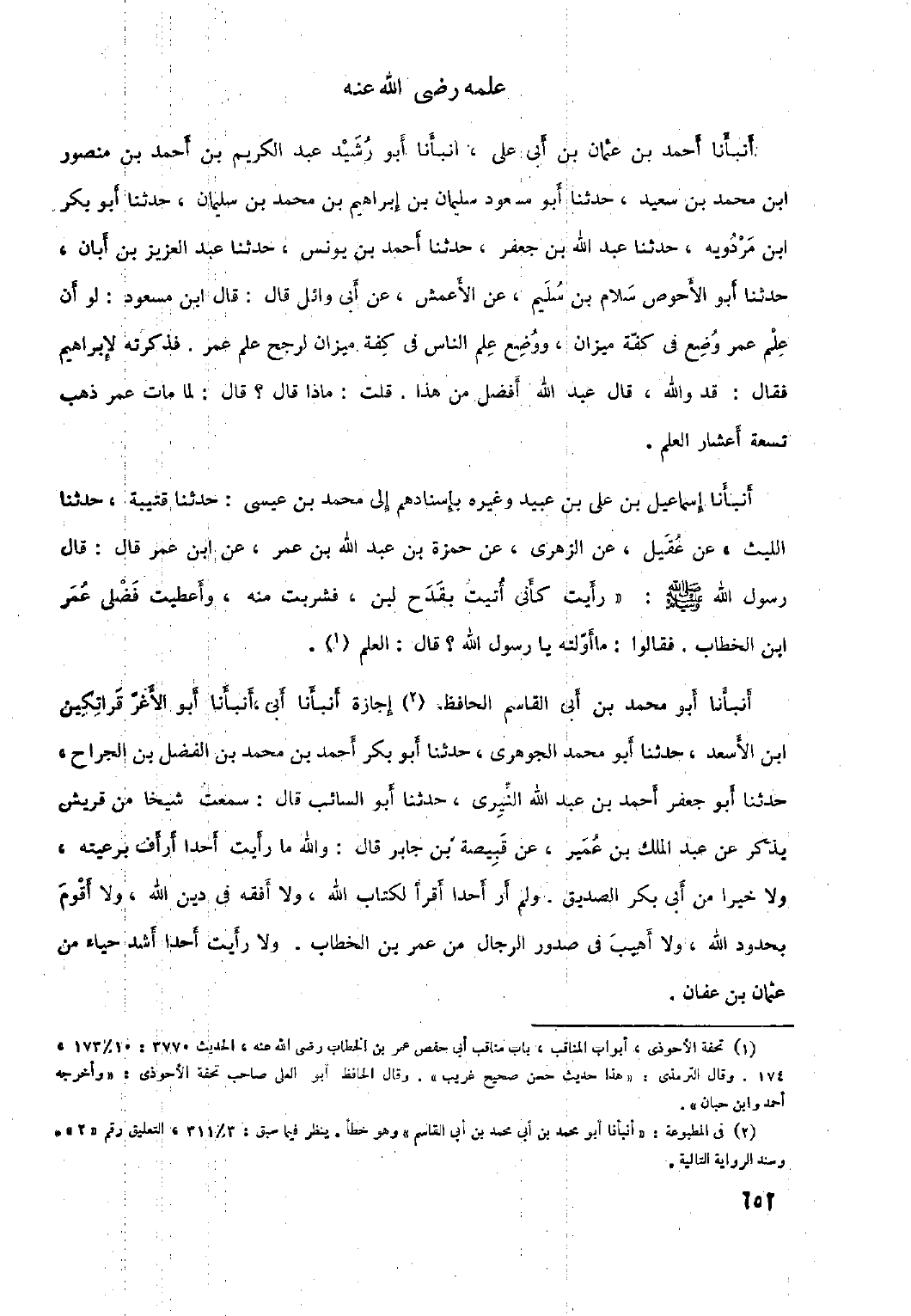 أَنْبَأَنَا إِسْمَاعِيلُ بْنُ عَلِيِّ بْنِ عُبَيْدٍ وَغَيْرُهُ بِإِسْنَادِهِمْ إِلَى مُحَمَّدِ بْنِ عِيسَى: حَدَّثَنَا قُتَيْبَةُ، حَدَّثَنَا اللَّيْثُ، عَنْ عَقِيلٍ، عَنِ الزُّهْرِيِّ، عَنْ حَمْزَةَ بْنِ عَبْدِ اللَّهِ بْنِ عُمَرَ، عَنِ ابْنِ عمر قال: قال رسول الله صلى الله عَلَيْهِ وَسَلَّمَ: «رَأَيْتُ كَأَنِّي أُتِيتُ بِقَدَحِ لَبَنٍ، فشربت منه، وأعطيت فضلي عمر ابن الْخَطَّابِ. فَقَالُوا: مَا أَوَّلْتَهُ يَا رَسُولَ اللَّهِ؟ قَالَ: الْعِلْمَ [١] . أنبأنا أَبُو مُحَمَّد بْن أَبِي الْقَاسِمِ الحافظ [٢] إجازة أنبأنا أَبِي، أنبأنا أَبُو الأغرّ قراتكين ابن الأسعد، حدثنا أبو محمد الجوهري، حدثنا أبو بكر أحمد بْن مُحَمَّد بْن الفضل بْن الجراح، حَدَّثَنَا أَبُو جَعْفَر أَحْمَد بْن عَبْد اللَّه النيري، حَدَّثَنَا أَبُو السائب قَالَ: سَمِعْتُ شيخًا من قريش يذكر عَنْ عَبْد الْمَلِكِ بْن عمير، عَنْ قبيصة بْن جَابِر قَالَ: والله ما رَأَيْت أحدًا أرأف برعيته، ولا خيرًا من أَبِي بَكْر الصديق. ولم أر أحدًا أقرأ لكتاب اللَّه، ولا أفقه فِي دين اللَّه، ولا أقوم بحدود اللَّه، ولا أهيب فِي صدور الرجال من عُمَر بْن الخطاب. ولا رَأَيْت أحدًا أشد حياء من عثمان بن عفان.