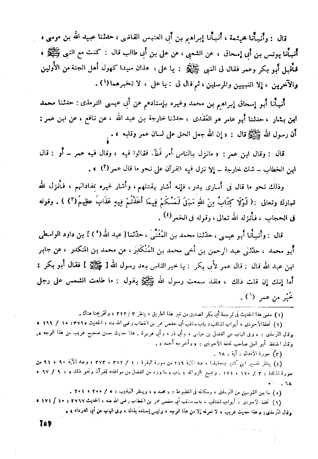 [٦] تحفة الأحوذي، أبواب المناقب، باب مناقب أبى حفص عمر بن الخطاب رضى الله عنه، الحديث ٣٧٦٧: ١٠/ ١٧١، وقال الترمذي: «هذا حديث غريب، لا نعرفه إلا من هذا الوجه، وليس إسناده بذاك، وفي الباب عن أبى الدرداء» .