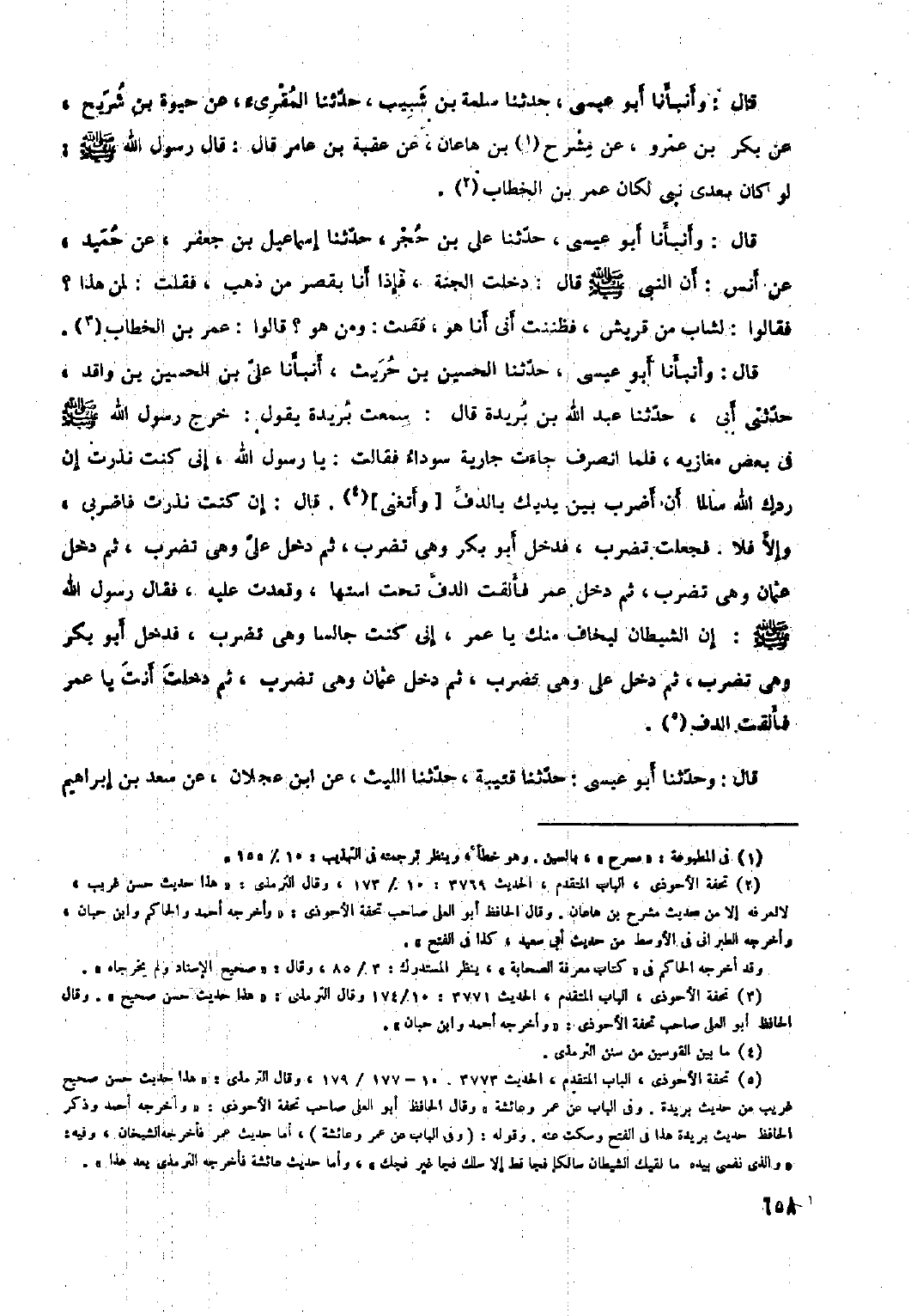 [٥] تحفة الأحوذي، الباب المتقدم، الحديث ٣٧٧٣: ١٠- ١٧٧/ ١٧٩، وقال الترمذي: «هذا حديث حسن صحيح غريب من حديث بريدة. وفي الباب عن عمر وعائشة» وقال الحافظ أبو العلى صاحب تحفة الأحوذي: «وأخرجه أحمد وذكر الحافظ حديث بريدة هذا في الفتح وسكت عنه. وقوله: (وفي الباب عن عمر وعائشة) ، أما حديث عمر فأخرجه الشيخان، وفيه: