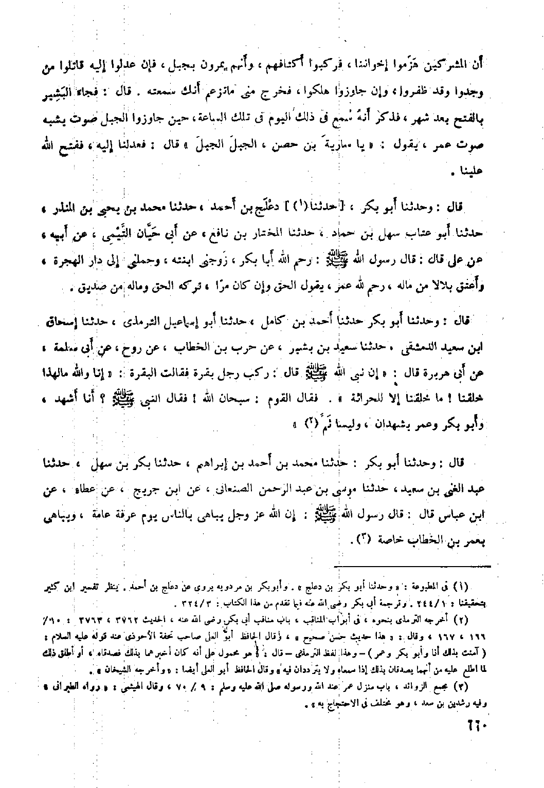 قَالَ: وَحَدَّثَنَا أَبُو بَكْرٍ، [حَدَّثَنَا [١]] دِعْلِجُ بْنُ أَحْمَدَ، حَدَّثَنَا مُحَمَّدُ بْنُ يَحْيَى بْنِ الُمْنِذِر، حَدَّثَنَا أَبُو عَتَّابٍ سَهْلُ بْنُ حَمَّادٍ، حَدَّثَنَا الْمُخْتَارُ بْنُ نَافِعٍ، عَنْ أَبِي حَيَّانَ التَّيْمِيِّ، عَنْ أَبِيهِ، عَنْ عَلِيٍّ قَالَ: قَالَ رَسُولُ اللَّهِ صَلَّى اللَّهُ عَلَيْهِ وَسَلَّمَ: رَحِمَ اللَّهُ أَبَا بَكْرٍ، زَوَّجَنِي ابْنَتَهُ، وَحَمَلَنِي إِلَى دَارِ الْهِجْرَةِ، وَأَعْتَقَ بِلالا مِنْ مَالِهِ، رَحِمَ اللَّهُ عُمَرَ، يَقُولُ الْحَقَّ وَإِنْ كَانَ مُرًّا، تَرَكَهُ الْحَقُّ وَمَا لَهُ مِنْ صَدِيقٍ. قَالَ: وَحَدَّثَنَا أَبُو بَكْرٍ حَدَّثَنَا أَحْمَدُ بْنُ كَامِلٍ، حَدَّثَنَا أَبُو إِسْمَاعِيلَ التِّرْمِذِيُّ، حدثنا إسحاق ابن سَعِيدٍ الدِّمَشْقِيُّ، حَدَّثَنَا سَعِيدُ بْنُ بَشِيرٍ، عَنْ حَرْبِ بْنِ الْخَطَّابِ، عَنْ رَوْحٍ، عَنْ أَبِي سَلَمَةَ، عَنْ أَبِي هُرَيْرَةَ قَالَ: «أَنَّ نَبِيَّ اللَّهِ صَلَّى اللَّهُ عَلَيْهِ وَسَلَّمَ قَالَ: رَكِبَ رَجُلٌ بَقَرَةً فَقَالَتِ الْبَقَرَةُ: «إِنَّا وَاللَّهِ مَا لِهَذَا خُلِقْنَا! مَا خُلِقْنَا إِلا لِلْحِرَاثَةِ» . فَقَالَ الْقَوْمُ: سُبْحَانَ اللَّهِ! فَقَالَ النَّبِيُّ صَلَّى اللَّهُ عَلَيْهِ وَسَلَّمَ؟ أَنَا أَشْهَدُ، وَأَبُو بَكْرٍ وَعُمَرُ يَشْهَدَانِ، وَلَيْسَا ثَمَّ [٢] » ، قَالَ: وَحَدَّثَنَا أَبُو بَكْرٍ: حَدَّثَنَا مُحَمَّدُ بْنُ أَحْمَدَ بْنِ إِبْرَاهِيمَ، حَدَّثَنَا بَكْرُ بْنُ سَهْلٍ، حَدَّثَنَا عَبْدُ الْغَنِيِّ بْنُ سَعِيدٍ، حَدَّثَنَا مُوسَى بْنُ عَبْدِ الرَّحْمَنِ الصَّنْعَانِيُّ، عَنِ ابْنِ جُرَيْجٍ، عَنْ عَطَاءٍ، عَنِ ابْنِ عَبَّاسٍ قَالَ: قَالَ رَسُولُ اللَّهِ صَلَّى اللَّهُ عَلَيْهِ وَسَلَّمَ: إِنَّ اللَّهَ عَزَّ وَجَلَّ يُبَاهِي بِالنَّاسِ يَوْمَ عَرَفَةَ عَامَّةً، وَيُبَاهِي بِعُمَرَ بْنِ الخطاب خاصة [٣] .