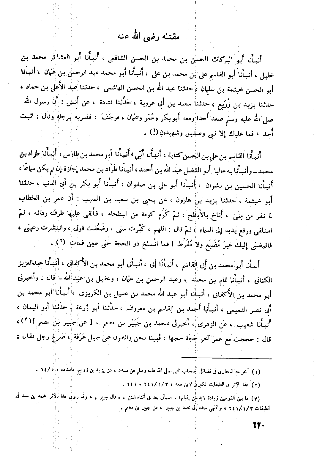 أَنْبَأَنَا أَبُو الْبَرَكَاتِ الْحَسَنِ بْنِ مُحَمَّدِ بْنِ الْحَسَنِ الشَّافِعِيُّ، أَنْبَأَنَا أَبُو الْعَشَائِرِ مُحَمَّدُ بْنُ خَلِيلٍ، أَنْبَأَنَا أَبُو الْقَاسِمِ عَلِيُّ بْنُ مُحَمَّدِ بْنِ عَلِيٍّ، أَنْبَأَنَا أَبُو مُحَمَّدٍ عَبْدُ الرَّحْمَنِ بْنُ عُثْمَانَ، أَنْبَأَنَا أَبُو الْحَسَنِ خَيْثَمَةُ بْنُ سُلَيْمَانَ، حَدَّثَنَا عَبْدُ اللَّهِ بْنُ الْحَسَنِ الْهَاشِمِيُّ، حَدَّثَنَا عَبْدُ الأَعْلَى بْنُ حَمَّادٍ، حَدَّثَنَا يَزِيدُ بْنُ زُرَيْعٍ، حَدَّثَنَا سَعِيدُ بْنُ أَبِي عَرُوبَةَ، حَدَّثَنَا قَتَادَةُ، عَنْ أنس: أن رسول الله صلى الله عليه وَسَلَّمَ صَعِدَ أُحُدًا وَمَعَهُ أَبُو بَكْرٍ وَعُمَرُ وَعُثْمَانُ، فَرَجَفَ، فَضَرَبَهُ بِرِجْلِهِ وَقَالَ: اثْبُتْ أُحُدُ، فَمَا عَلَيْكَ إِلا نَبِيٌّ وَصِدِّيقٌ وَشَهِيدَانِ [١] . أَنْبَأَنَا الْقَاسِمُ بْنُ عَلِيِّ بْنِ الْحَسَنِ كِتَابَةً، أَنْبَأَنَا أَبِي، أَنْبَأَنَا أَبُو مُحَمَّدِ بْنُ طَاوُسٍ، أَنْبَأَنَا طِرَادُ بْنُ مُحَمَّدٍ- وَأَنْبَأَنَا بِهِ عَالِيًا أَبُو الْفَضْلِ عَبْدُ اللَّهِ بْنُ أَحْمَدَ، أَنْبَأَنَا طِرَادُ بْن مُحَمَّد إِجَازَةً إِنْ لَمْ يَكُنْ سَمَاعًا، أَنْبَأَنَا الْحُسَيْنُ بْنُ بِشْرَانَ، أَنْبَأَنَا أَبُو عَلِيِّ بْنُ صَفْوَانَ، أَنْبَأَنَا أَبُو بَكْرِ بْنُ أَبِي الدُّنْيَا، حَدَّثَنَا أَبُو خَيْثَمَةَ، حَدَّثَنَا يَزِيدُ بْن هَارُونَ، عَنْ يَحْيَى بْن سَعِيد بْنِ الْمُسَيِّبِ: أَنَّ عُمَرَ بْنَ الْخَطَّابِ لَمَّا نَفَرَ مِنْ مِنًى، أَنَاخَ بِالأَبْطَحِ، ثُمَّ كَوَّمَ كُومَةً مِنَ الْبَطْحَاءِ، فَأَلْقَى عَلَيْهَا طَرْفَ رِدَائِهِ، ثُمَّ اسْتَلْقَى وَرَفَعَ يَدَيْهِ إِلَى السَّمَاءِ، ثُمَّ قَالَ: اللَّهمّ، كَبِرَتْ سِنِّي، وَضَعُفَتْ قُوَّتِي، وَانْتَشَرَتْ رَعِيَّتِي، فَاقْبُضْنِي إِلَيْكَ غَيْرَ مُضَيِّعٍ وَلا مُفَرِّطٍ! فَمَا انْسَلَخَ ذُو الْحِجَّةِ حَتَّى طُعِنَ فَمَاتَ [٢] .