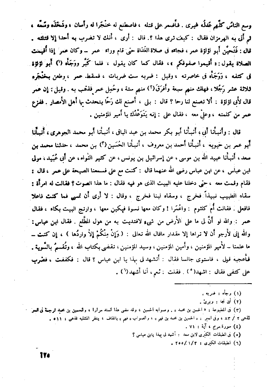 قَالَ: وَأَنْبَأَنَا أَبِي، أَنْبَأَنَا أَبُو بَكْرٍ مُحَمَّدُ بْنُ عَبْدِ الْبَاقِي، أَنْبَأَنَا أَبُو مُحَمَّدٍ الْجَوْهَرِيُّ، أَنْبَأَنَا أَبُو عُمَرَ بْنُ حَيُّوَيْهِ، أَنْبَأَنَا أَحْمَدُ بْنُ مَعْرُوفٍ، أَنْبَأَنَا الْحُسَيْنُ [٣] بْنُ مُحَمَّدٍ، حَدَّثَنَا مُحَمَّدُ بْنُ سَعْدٍ، أَنْبَأَنَا عُبَيْدُ اللَّهِ بْنُ مُوسَى، عَنْ إِسْرَائِيلَ بْنِ يُونُسَ، عَنْ كَثِيرٍ النَّوَّاءِ، عَنْ أَبِي عُبَيْدٍ، مَوْلَى ابْنِ عَبَّاسٍ، عَنِ ابْنِ عَبَّاسٍ رَضِيَ اللَّهُ عَنْهُمَا قَالَ: كُنْتُ مَعَ عَلِيٍّ فَسَمِعْنَا الصَّيْحَةَ عَلَى عُمَرَ، قَالَ: