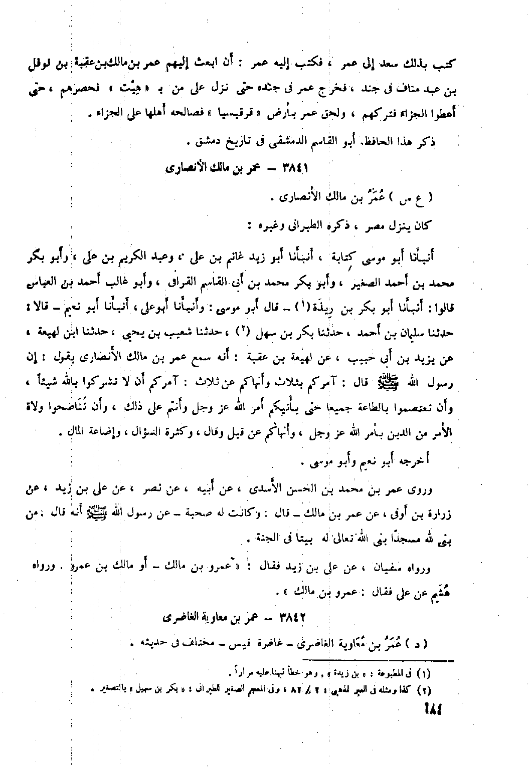 أَخْرَجَهُ أَبُو نُعَيْمٍ وَأَبُو مُوسَى. وَرَوَى عُمَرُ بْنُ مُحَمَّدِ بْنِ الْحَسَنِ الأَسَدِيُّ، عَنْ أَبِيهِ، عَنْ نَصْرٍ، عَنْ عَلِيِّ بْنِ زَيْدٍ، عَنْ زُرَارَةَ بْنِ أَوْفَى، عَنْ عُمَرَ بْنِ مَالِكٍ- قَالَ: وَكَانَتْ لَهُ صُحْبَةٌ- عَنْ رَسُولِ الله صلى الله عليه وسلم أنه قال: مَنْ بَنَى للَّه مَسْجِدًا بَنَى اللَّهُ تَعَالَى لَهُ بَيْتًا فِي الْجَنَّةِ.