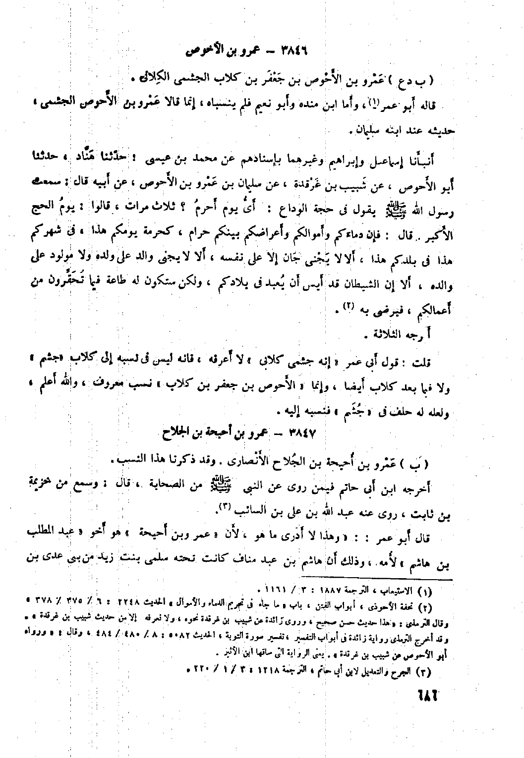 أَنْبَأَنَا إِسْمَاعِيلُ وَإِبْرَاهِيمُ وَغَيْرُهُمَا بِإِسْنَادِهِمْ عَنْ مُحَمَّدِ بْنِ عِيسَى: حَدَّثَنَا هَنَّادٌ، حَدَّثَنَا أَبُو الأَحْوَصِ، عَنْ شَبِيبِ بْنِ غَرْقَدَةَ، عَنْ سُلَيْمَانَ بْنِ عَمْرِو بْنِ الأَحْوَصِ، عَنْ أَبِيهِ قَالَ: سَمِعْتُ رَسُول اللَّهِ صَلَّى الله عليه وسلم يقول في حَجَّةِ الْوَدَاعِ. أَيُّ يَوْمٍ أَحْرَمُ؟ ثَلاثَ مَرَّاتٍ، قَالُوا: يَوْمُ الْحَجِّ الأَكْبَرِ. قَالَ: فَإِنَّ دِمَاءَكُمْ وَأَمْوَالَكُمْ وَأَعْرَاضَكُمْ بَيْنَكُمْ حَرَامٌ، كَحُرْمَةِ يَوْمِكُمْ هَذَا، فِي شَهْرِكُمْ هَذَا فِي بَلَدِكُمْ هَذَا، أَلا لا يَجْنِي جَانٍ إِلا عَلَى نَفْسِهِ، أَلا لا يَجْنِي وَالِدٌ عَلَى وَلَدِهِ وَلا مَوْلُودٌ عَلَى وَالِدِهِ، أَلا إِنَّ الشَّيْطَانَ قَدْ أَيِسَ أَنْ يُعْبَدَ فِي بِلادِكُمْ، وَلَكِنْ سَتَكُونُ لَهُ طَاعَةٌ فِيمَا تُحَقِّرُونَ مِنْ أَعْمَالِكُمْ، فَيَرْضَى بِهِ [٢] . أَخْرَجَهُ الثَّلاثَةُ.