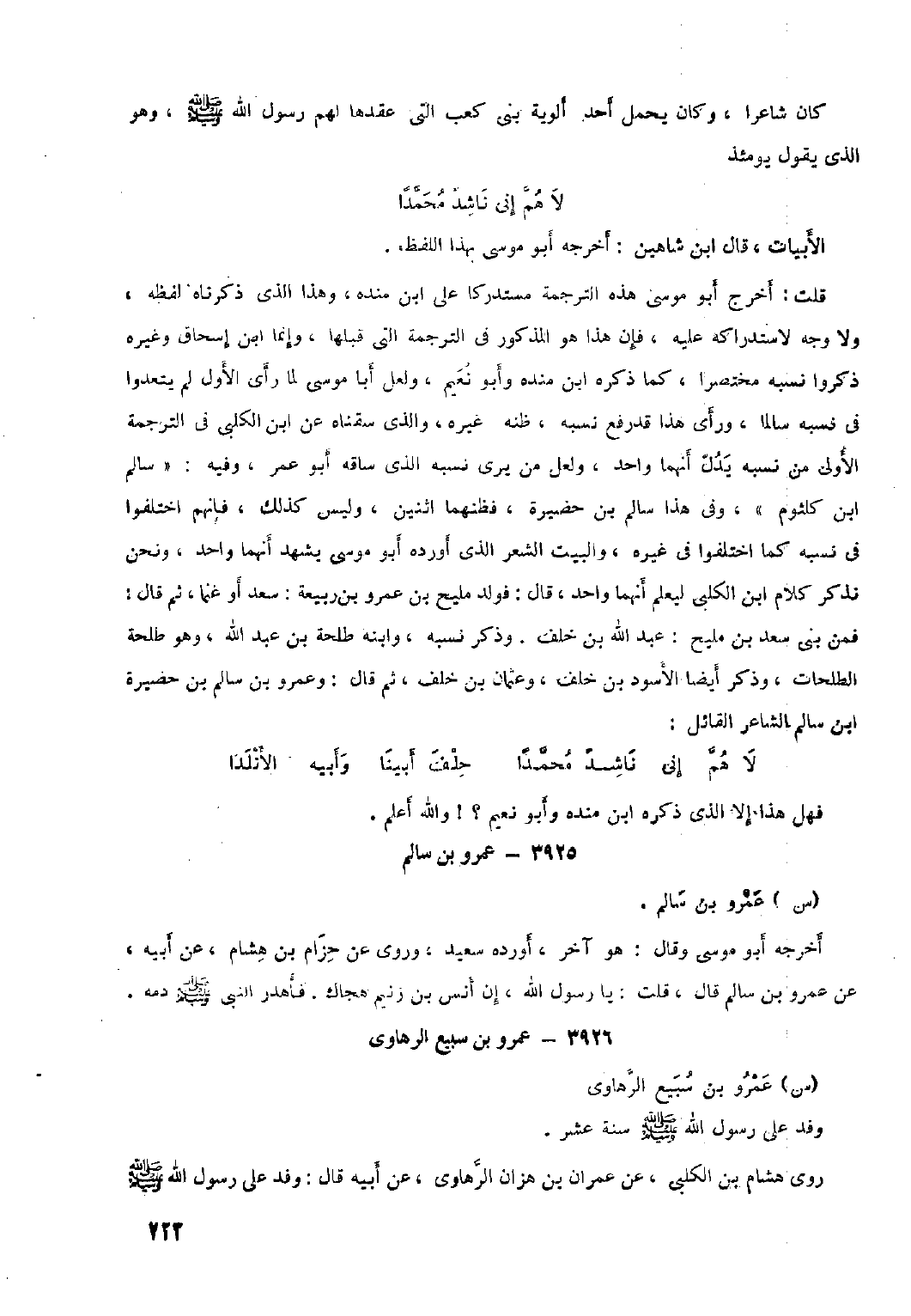 قلت: أخرج أَبُو موسى هَذِهِ الترجمة مستدركًا عَلَى ابْن منده، وهذا الَّذِي ذكرناه لفظه، ولا وجه لاستدراكه عَلَيْهِ، فإن هَذَا هُوَ المذكور فِي الترجمة التي قبلها، وَإِنما ابْن إِسْحَاق وغيره ذكروا نسبه مختصرًا، كما ذكره ابْن منده وَأَبُو نعيم، ولعل أبا مُوسَى لما رَأَى الأول لم يتعدوا فِي نسبه سالما، ورأى هذا قد رفع نسبه، ظنه غيره، والذي سقناه عَنِ ابْنِ الكلبي فِي الترجمة الأولى من نسبه يدل أنهما واحد، ولعل من يرى نسبه الَّذِي ساقه أَبُو عمر، وفيه: «سالم ابن كلثوم» ، وفي هَذَا سالم بْن حضيرة، فظنهما اثنين، وليس كذلك، فإنهم اختلفوا فِي نسبه كما اختلفوا فِي غيره، والبيت الشعر الَّذِي أورده أَبُو مُوسَى يشهد أنهما واحد، ونحن نذكر كلام ابْن الكلبي ليعلم أنهما واحد، قَالَ: فولد مليح بْن عَمْرو بْن رَبِيعة: سعد أَوْ غنمًا، ثُمَّ قَالَ: