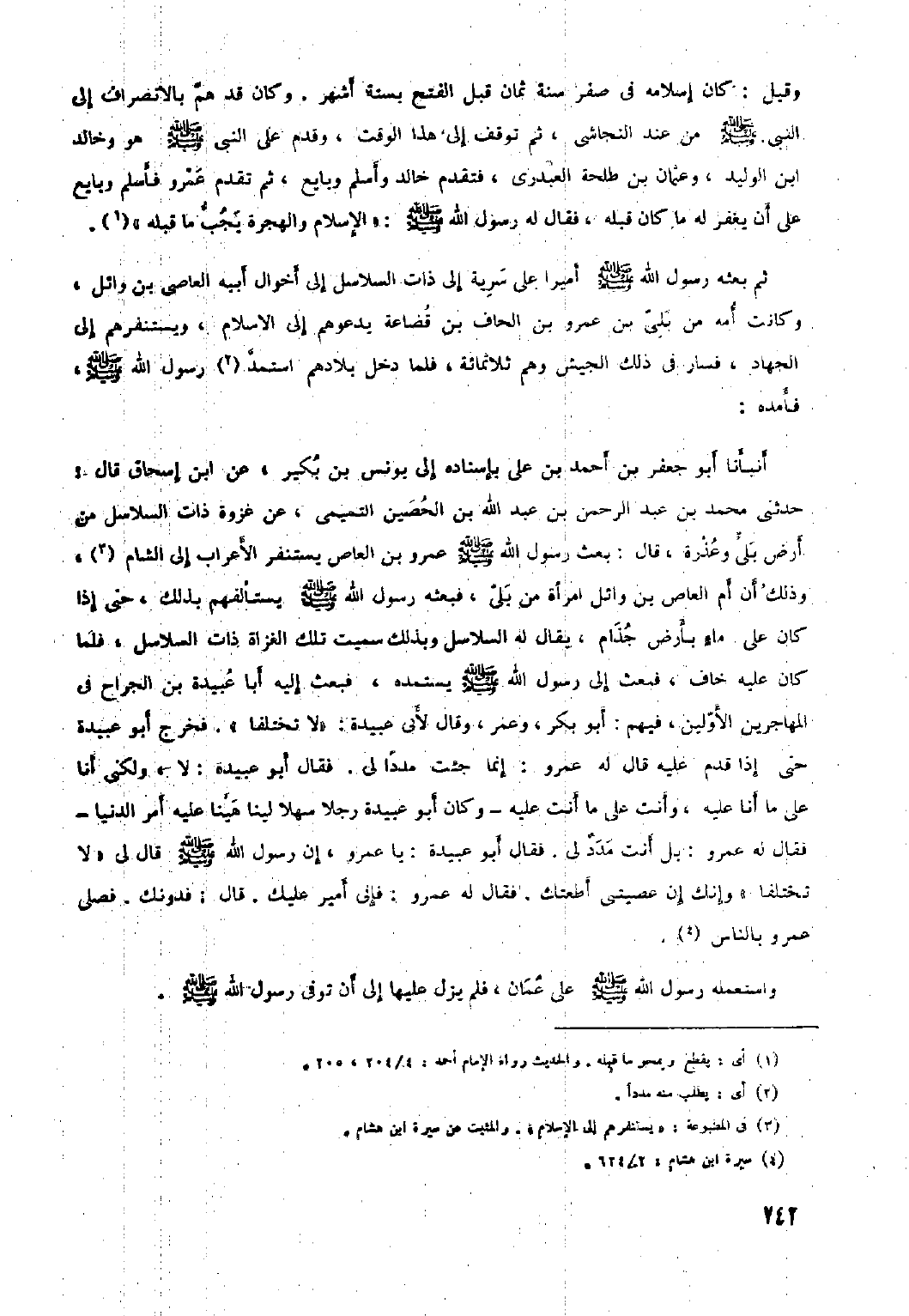 وقيل: كَانَ إسلامه فِي صفر سنة ثمان قبل الفتح بستة أشهر. وكان قَدْ هُمْ بالانصراف إِلَى النَّبِيّ صَلَّى اللَّهُ عَلَيْهِ وَسَلَّمَ من عند النجاشي، ثُمَّ توقف إِلَى هَذَا الوقت، وقدم عَلَى النَّبِيّ صَلَّى اللَّهُ عَلَيْهِ وَسَلَّمَ هو وخالد ابن الْوَلِيد، وعثمان بْن طلحة العبدري، فتقدم خَالِد وأسلم وبايع، ثُمَّ تقدم عَمْرو فأسلم وبايع عَلَى أن يغفر لَهُ ما كَانَ قبله، فقال له رسول الله صلى الله عليه وَسَلَّمَ: «الْإِسْلَام والهجرة يجب ما قبله» [١] . ثُمَّ بعثه رَسُول اللَّهِ صَلَّى اللَّهُ عَلَيْهِ وَسَلَّمَ أميرًا عَلَى سرية إِلَى ذات السلاسل إِلَى أخوال أبيه العاصي بْن وائل، وكانت أمه من بلي بْن عَمْرو بْن الحاف بْن قضاعة يدعوهم إِلَى الإسلام، ويستنفرهم إِلَى الجهاد، فسار فِي ذَلِكَ الجيش وهم ثلاثمائة، فلما دخل بلادهم استمد [٢] رَسُول اللَّه صَلَّى اللَّهُ عَلَيْهِ وَسَلَّمَ، فأمده: