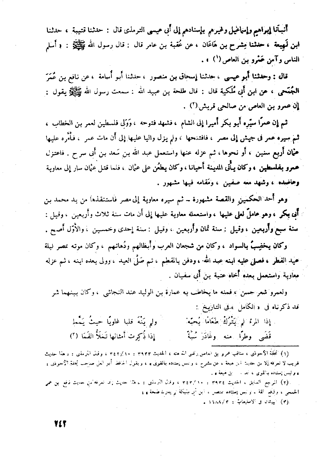أَنْبَأَنَا إِبْرَاهِيمُ وَإِسْمَاعِيلُ وَغَيْرُهُمْ بِإِسْنَادِهِمْ إِلَى أَبِي عِيسَى التِّرْمِذِيُّ قَالَ: حَدَّثَنَا قُتَيْبَةُ، حَدَّثَنَا ابْن لَهِيعَةَ، حَدَّثَنَا مِشْرَحُ بْنُ هَاعَانَ، عَنْ عُقْبَةَ بْنِ عَامِرٍ قَالَ: قَالَ رَسُولُ اللَّهِ صَلَّى اللَّهُ عَلَيْهِ وَسَلَّمَ: «أَسْلَمَ النَّاسُ وَآمَنَ عَمْرُو بْنُ الْعَاصِ [١] » . قَالَ: وحَدَّثَنَا أَبُو عِيسَى، حَدَّثَنَا إِسْحَاقُ بْنُ مَنْصُورٍ، حَدَّثَنَا أَبُو أُسَامَةَ، عَنْ نَافِعِ بْنِ عُمَرَ الْجُمَحِيِّ، عَنِ ابْنِ أَبِي مُلَيْكَةَ قَالَ: قَالَ طَلْحَةُ بْنُ عُبَيْدِ اللَّهِ: سمعت رسول الله صلى الله عليه وسلم يَقُولُ: إِنَّ عَمْرَو بْنَ الْعَاصِ مِنْ صَالِحِي قُرَيْشٍ [٢] . ثُمَّ إن عمرًا سيره أَبُو بَكْر أميرًا إِلَى الشام، فشهد فتوجه، وولي فلسطين لعمر بْن الخطاب، ثُمَّ سيره عُمَر فِي جيش إِلَى مصر، فافتتحها، ولم يزل واليًا عليها إِلَى أن مات عُمَر، فأمره عليها عثمان أربع سنين، أَوْ نحوها، ثُمَّ عزله عَنْهَا واستعمل عَبْدُ اللَّهِ بْنُ سَعْدِ بْنِ أَبِي سَرْحٍ. فاعتزل عَمْرو بفلسطين، وكان يأتي المدينة أحيانًا، وكان يطعن عَلَى عثمان، فلما قتل عثمان سار إِلَى معاوية وعاضده، وشهد معه صفين، ومقامه فيها مشهور.