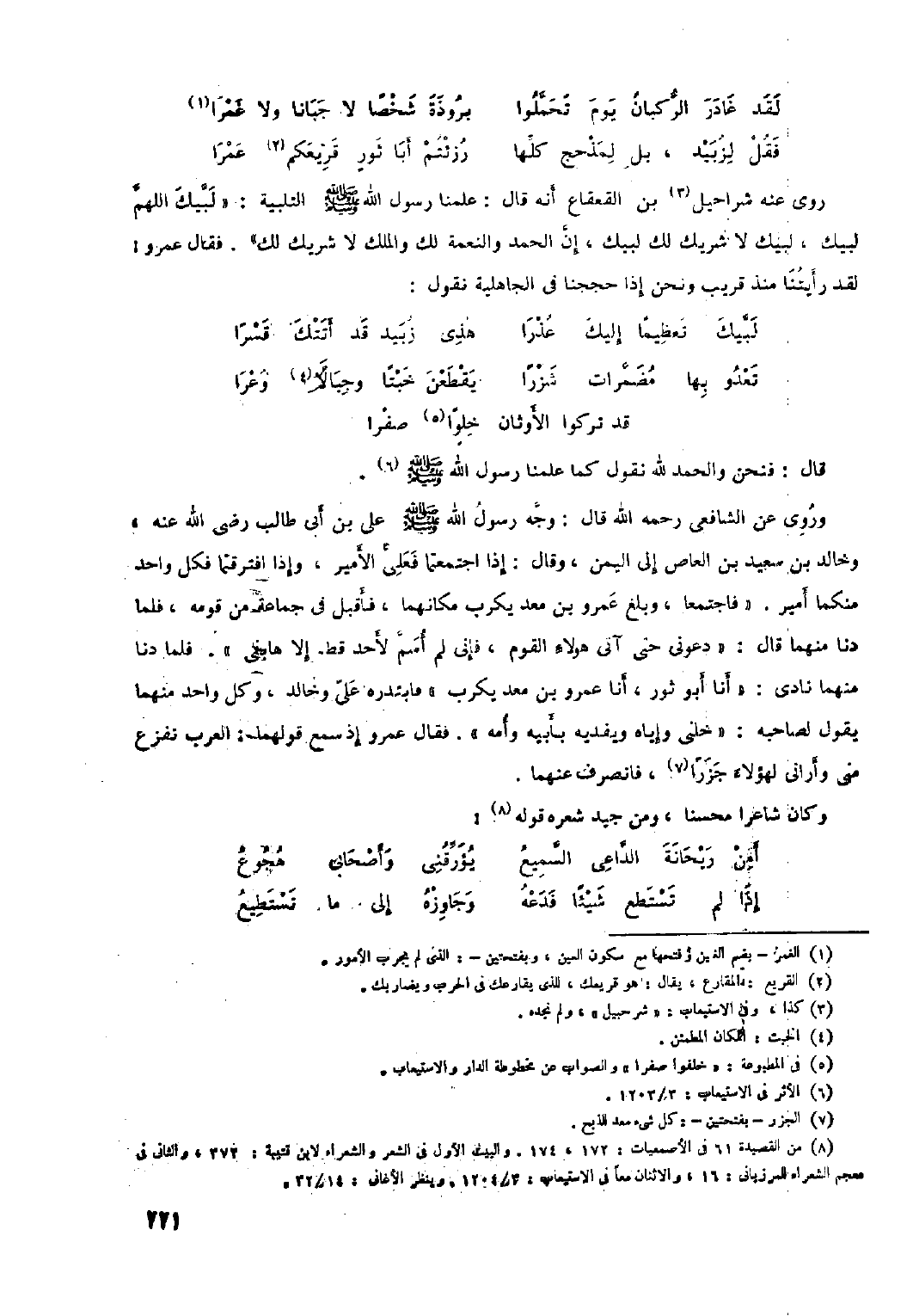 روى عَنْهُ شراحيل [٣] بْن القعقاع أَنَّهُ قَالَ: علمنا رَسُول اللَّه صَلَّى اللَّهُ عَلَيْهِ وَسَلَّمَ التلبية: «لبيك اللَّهمّ لبيك، لبيك لا شريك لَكَ لبيك، إن الحمد والنعمة لَكَ والملك لا شريك لك» . فَقَالَ عَمْرو: