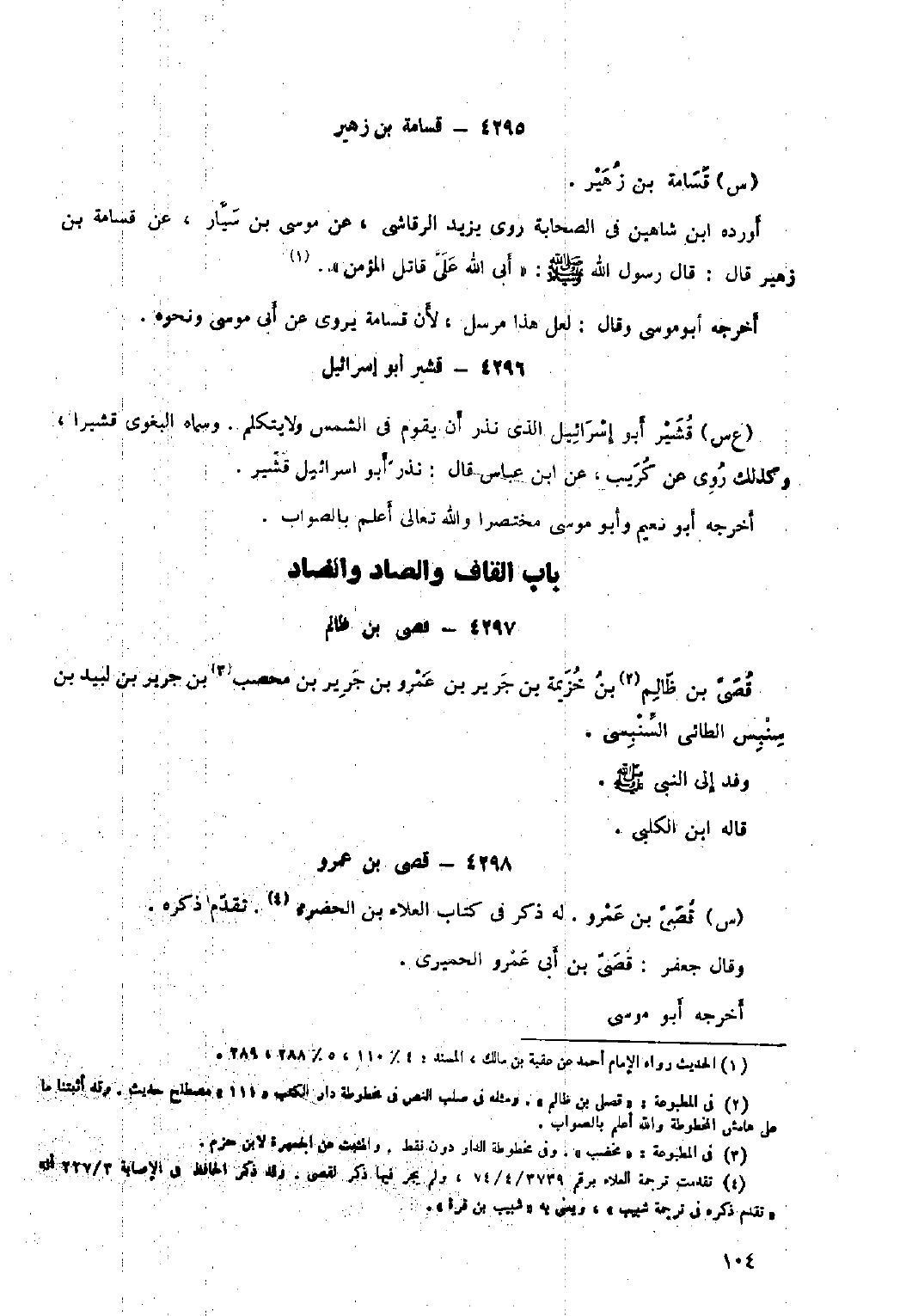 أورده ابْن شاهين فِي الصحابة رَوَى يَزِيدُ الرَّقَاشِيُّ، عَنْ مُوسَى بْنِ سَيَّارٍ، عَنْ قَسَامَةَ بْن زُهَيْرٍ قَالَ: قَالَ رَسُول اللَّهِ صَلَّى اللَّهُ عليه وآله وَسَلَّمَ: «أَبَى اللَّهُ عَلَيَّ قَاتِلَ الْمُؤْمِنِ» [١] أَخْرَجَهُ أَبُو مُوسَى وقَالَ: لعل هَذَا مرسل، لأن قسامة يروى عن أبى موسى ونحوه.