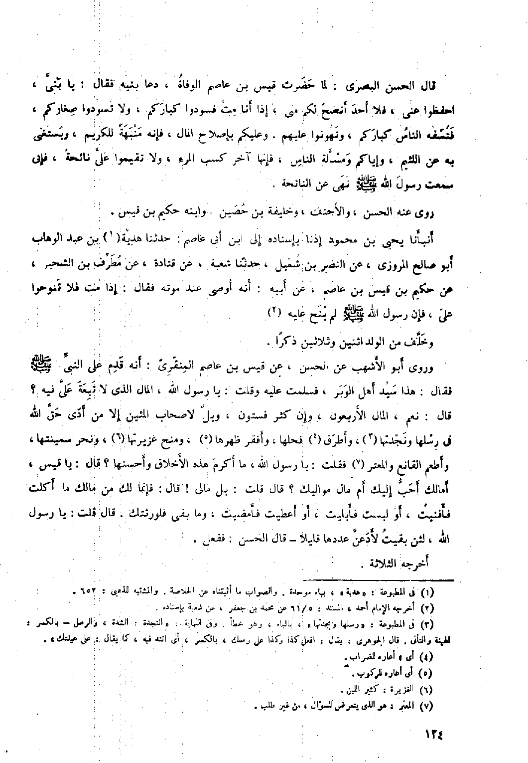 قَالَ: نعم، المال الأربعون، وَإِن كثر فستون، ويل لأصحاب المئين إلا من أدى حق اللَّه فِي رسلها ونجدتها [٣] ، وأطرق [٤] فحلها، وأفقر ظهرها [٥] ، ومنح غزيرتها [٦] ، ونحر سمينتها، وأطعم القانع والمعتر [٧] فقلت: يا رَسُول اللَّه، ما أكرم هَذِهِ الأخلاق وأحسنها؟ قال: يا قيس، أما لك أحب إليك أم مال مواليك؟ قَالَ قلت: بل مالي! قَالَ: فإنما لَكَ من مَالِك ما أكلت فأفنيت، أَوْ لبست فأبليت، أَوْ أعطيت فأمضيت، وما بقي فلورثتك. قَالَ قلت: يا رَسُول اللَّهِ، لئن بقيت لأدعن عددها قليلا- قال الحسن: ففعل. أخرجه الثلاثة.