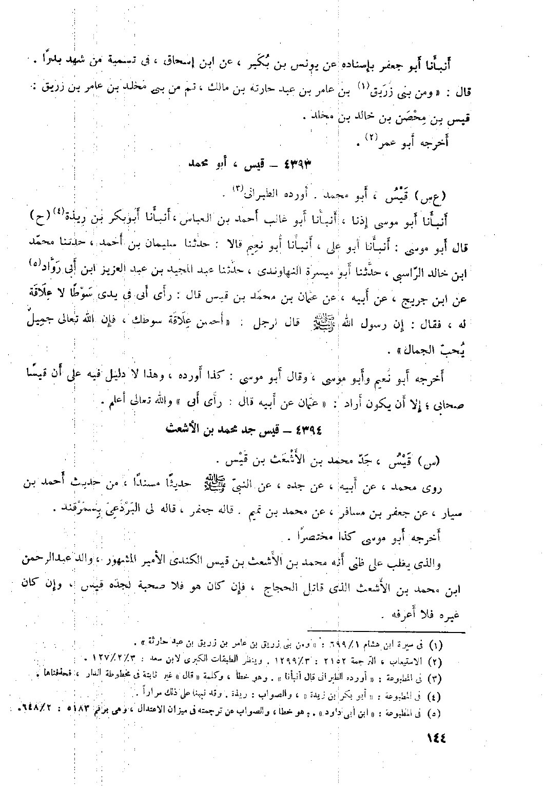 أَنْبَأَنَا أَبُو مُوسَى إِذْنًا، أَنْبَأَنَا أَبُو غَالِبٍ أحمد بن العباس، أنبأنا أَبُو بَكْرِ بْنُ رِيذَةَ [٤] (ح) قَالَ أَبُو مُوسَى: أَنْبَأَنَا أَبُو عَلِيٍّ، أَنْبَأَنَا أَبُو نُعَيْمٍ قَالا: حَدَّثَنَا سليمان بْن أحمد، حدثنا مُحَمَّد ابن خَالِدٍ الرَّاسِبِيُّ، حَدَّثَنَا أَبُو مَيْسَرَةَ النَّهَاوَنْدِيُّ، حَدَّثَنَا عبد المجيد بن عبد العزيز ابن أَبِي رَوَّادٍ [٥] عَنِ ابْنِ جُرَيْجٍ، عَنْ أَبِيهِ، عَنْ عُثْمَانَ بْنِ مُحَمَّدِ بْنِ قَيْسٍ قَالَ: رَأَى أَبِي فِي يَدِي سَوْطًا لا عِلاقَةَ لَهُ، فَقَالَ: إِنَّ رَسُولَ اللَّهِ صَلَّى اللَّهُ عليه وآله وَسَلَّمَ قَالَ لِرَجُلٍ: «أَحْسِنْ عِلاقَةَ سَوْطِكَ، فَإِنَّ اللَّهَ تَعَالَى جَمِيلٌ يُحِبُّ الْجَمَالَ» . أَخْرَجَهُ أَبُو نعيم وأبو موسى، وقال أبو موسى: كذا أَوْرَدَهُ، وَهَذَا لا دَلِيلَ فِيهِ عَلَى أَنَّ قَيْسًا صَحَابِيٌّ، إِلا أَنْ يَكُونَ أَرَادَ: «عُثْمَانَ عَنْ أَبِيهِ قَالَ: رَأَى أَبِي» وَاللَّهُ تَعَالى أعلم.