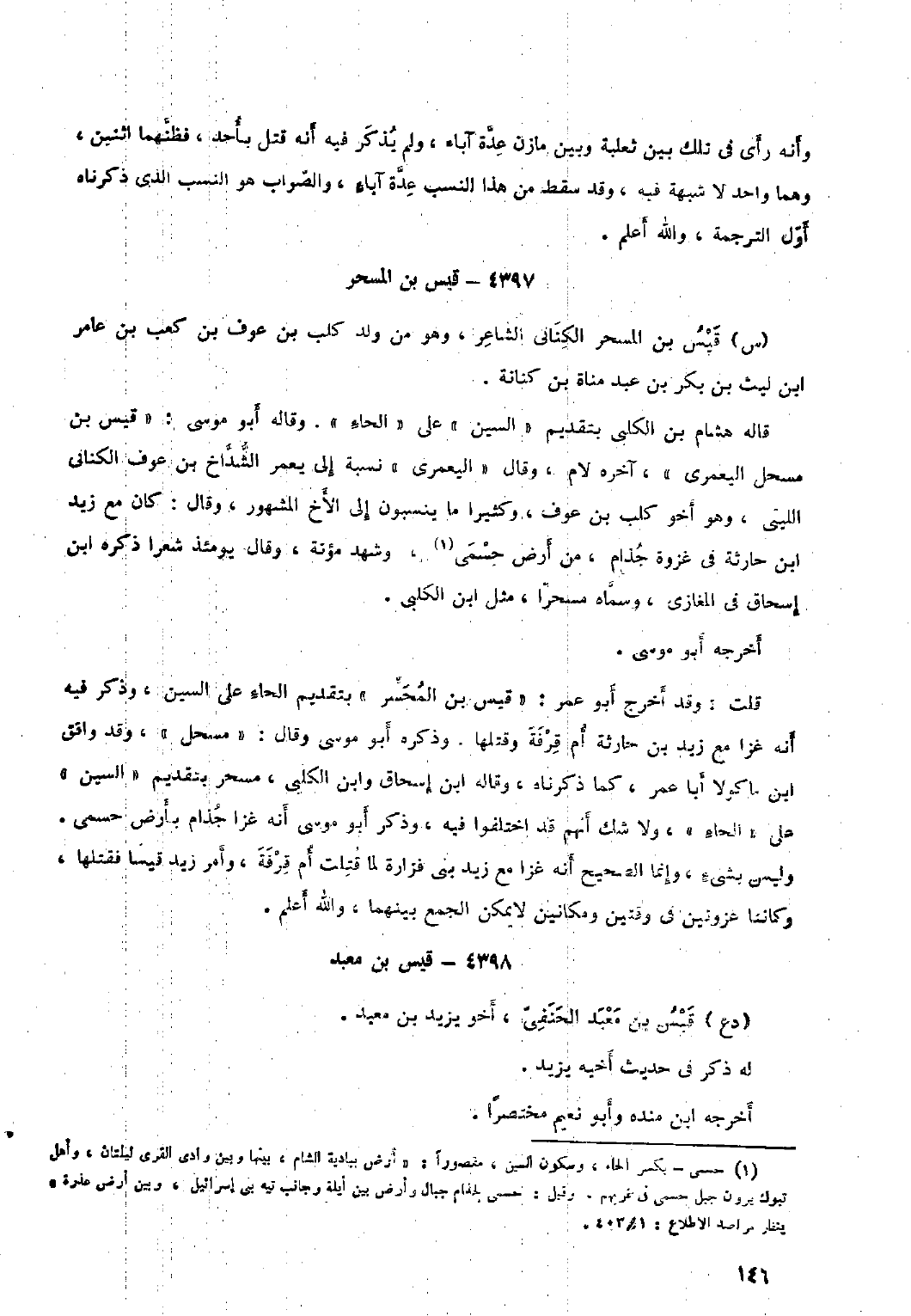قلت: وَقَدْ أخرج أَبُو عُمَر: «قيس بْن المحسر» بتقديم الحاء عَلَى السين، وذكر فِيهِ أَنَّهُ غزا مَعَ زَيْد بْن حارثة أم قرفة وقتلها. وذكره أَبُو مُوسَى وقَالَ: «مسحل» ، وَقَدْ وافق ابْن ماكولا أبا عُمَر، كما ذكرناه، وقاله ابْن إِسْحَاق وابن الكلبي، مسحر بتقديم «السين» عَلَى «الحاء» ، ولا شك أنهم قَدْ اختلفوا فِيهِ، وذكر أَبُو مُوسَى أَنَّهُ غزا جذام بأرض حسمي.