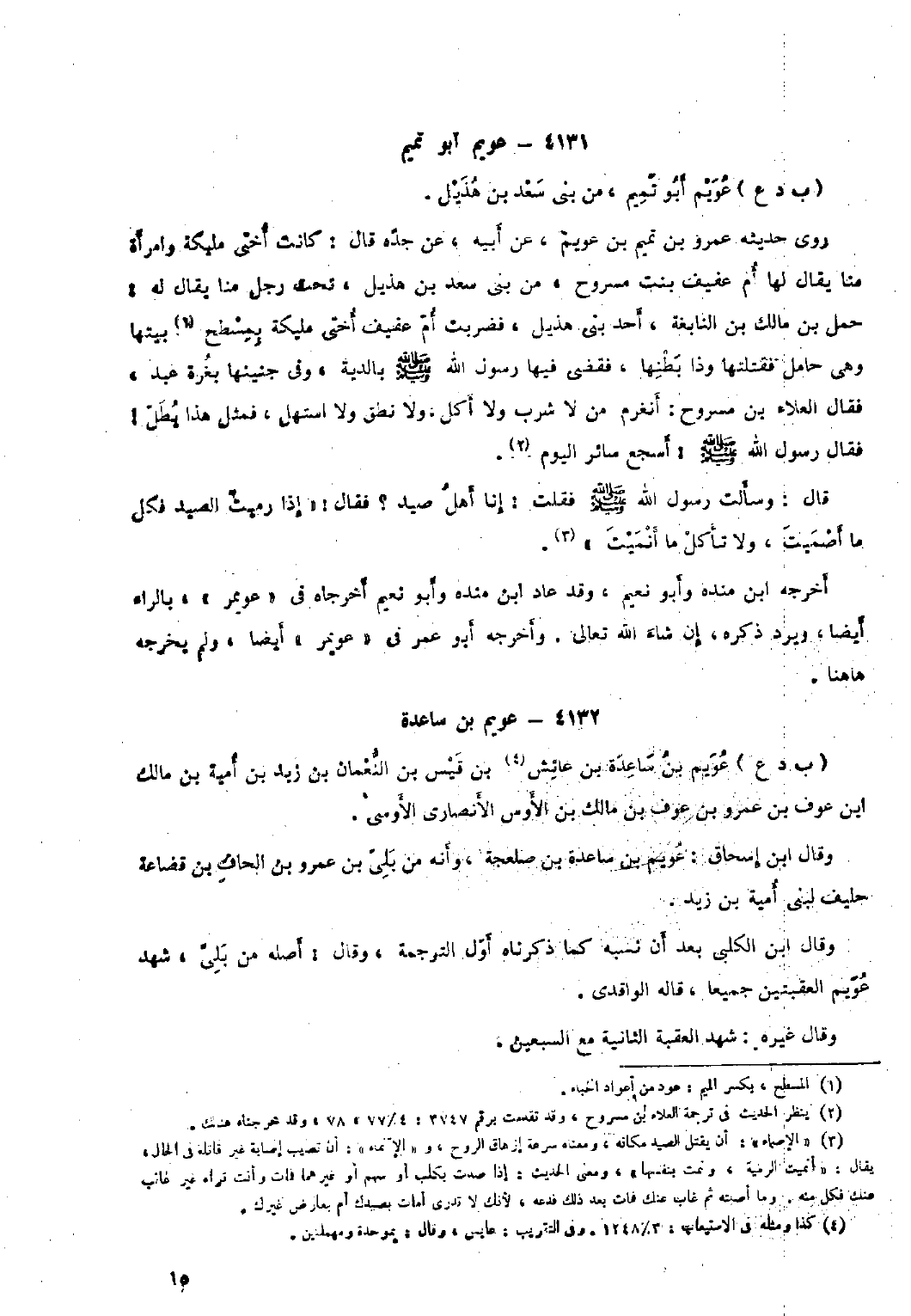 قَالَ: وسألت رَسُول الله صلّى الله عليه وآله وَسَلَّمَ فقلت: أَنَا أهل صيد؟ فقال: «إِذَا رميت الصيد فكل ما أصميت، ولا تأكل ما أنميت» [٣] . أَخْرَجَهُ ابْن منده وَأَبُو نعيم، وَقَدْ عاد ابْن منده وَأَبُو نعيم أخرجاه فِي «عويمر» ، بالراء أيضًا، ويرد ذكره، إن شاء اللَّه تَعَالى. وأخرجه أَبُو عُمَر فِي «عويمر» أيضا، ولم يخرجه هاهنا.