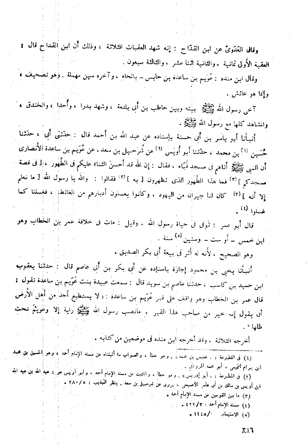 أَنْبَأَنَا أَبُو يَاسِرِ بْنِ أَبِي حَسَنَةَ بإسناده عن عبد الله بن أحمد قال: حَدَّثَنِي أَبِي، حَدَّثَنَا حُسَيْنُ [١] بْنُ مُحَمَّدٍ، حَدَّثَنَا أَبُو أُوَيْسٍ [٢] عَنْ شُرَحْبِيلَ بْنِ سَعْدٍ، عَنْ عُوَيْمِ بْنِ سَاعِدَةَ الْأَنْصَارِيِّ أَنَّ النَّبِيَّ صَلَّى الله عليه وآله وَسَلَّمَ أَتَاهُمْ فِي مَسْجِدِ قِبَاءَ، فَقَالَ: إِنَّ اللَّهَ قَدْ أَحْسَنَ الثَّنَاءَ عَلَيْكُمْ فِي الطُّهُورِ، [فِي قِصَّةِ مَسْجِدِكُمْ] [٣] فَمَا هَذَا الطُّهُورُ الَّذِي تَطَهَّرُونَ [بِهِ] [٣] فَقَالُوا: وَاللَّهِ يَا رَسُولَ اللَّهِ [مَا نَعْلَمُ إِلا أَنَّهُ] [٣] كَانَ لَنَا جِيرَانٌ من اليهود، وكانوا يعسلون أَدْبَارَهُمْ مِنَ الْغَائِطِ، فَغَسَلْنَا كَمَا غَسَلُوا [٤] . قَالَ أَبُو عُمَر: توفي فِي حياة رَسُول اللَّه، وقيل: مات فِي خلافة عُمَر بْن الخطاب وهو ابْن خمس- أَوْ ست- وستين [٥] سنة.