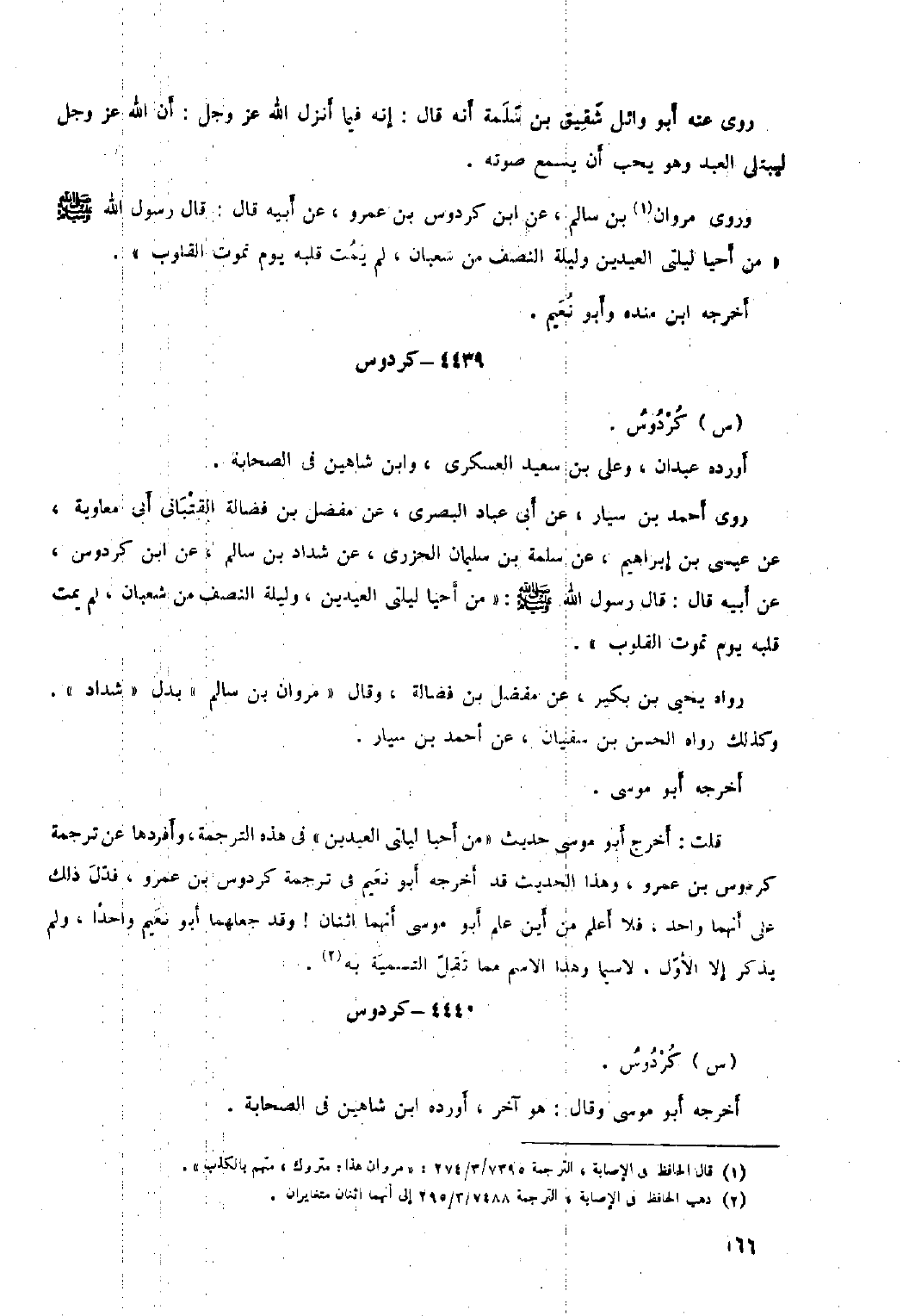 قلت: أخرج أَبُو مُوسَى حديث «من أحيا ليلتي العيدين» فِي هَذِهِ الترجمة، وأفردها عَنْ ترجمة كردوس بْن عَمْرو، وهذا الحديث قَدْ أَخْرَجَهُ أَبُو نعيم فِي ترجمة كردوس بْن عَمْرو، فدل ذَلِكَ عَلَى أنهما واحد، فلا أعلم من أَيْنَ علم أَبُو مُوسَى أنهما اثنان! وَقَدْ جعلهما أَبُو نعيم واحدًا، ولم يذكر إلا الأول، لا سيما وهذا الاسم مما تقلّ التسمية به [٢] .
