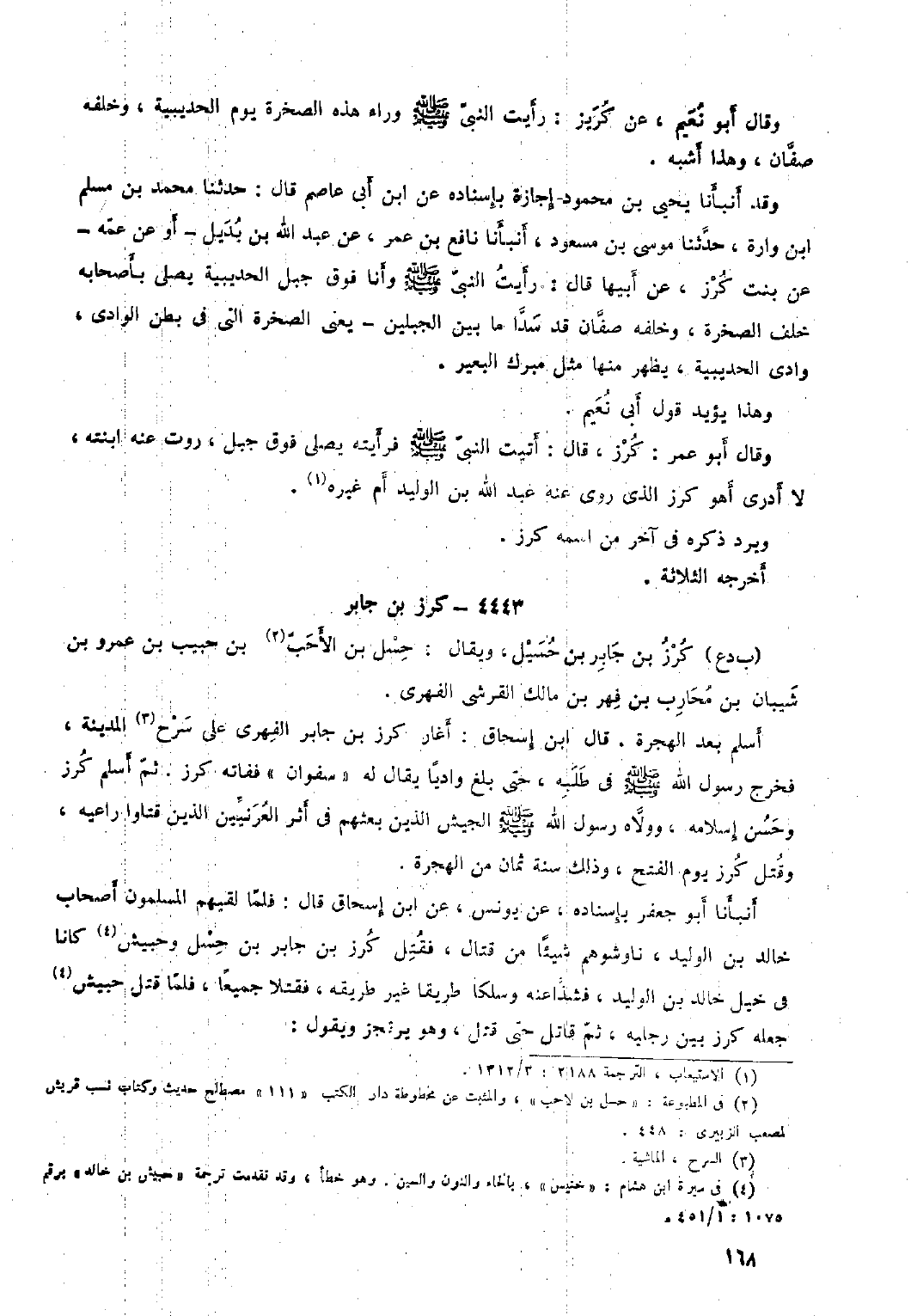 وقَالَ أَبُو عُمَر: كرز، قَالَ: أتيت النَّبِيّ صَلَّى الله عليه وآله وَسَلَّمَ فرأيته يصلي فوق جبل، روت عَنْهُ ابنته، لا أدري أهو كرز الَّذِي روى عَنْهُ عَبْد اللَّه بْن الْوَلِيد أم غيره [١] .