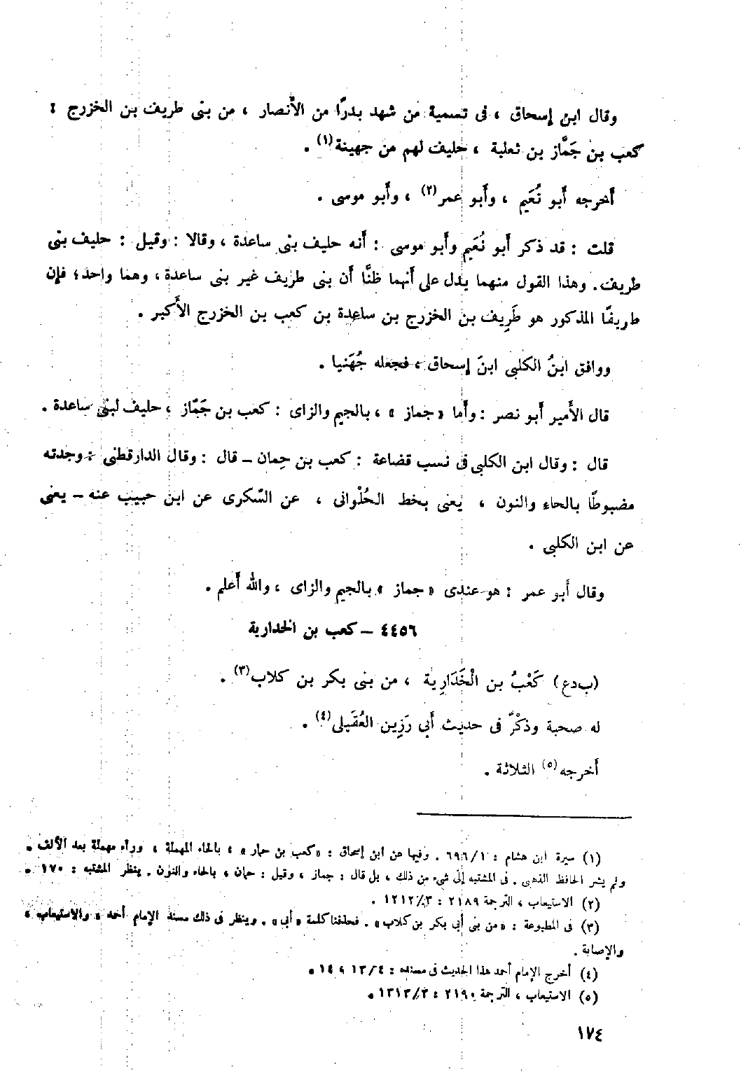 [١] سيرة ابن هشام: ١/ ٦٩٦. وفيها عن ابن إسحاق: «كعب بن حمار» ، بالحاء المهملة، وراء مهملة بعد الألف.