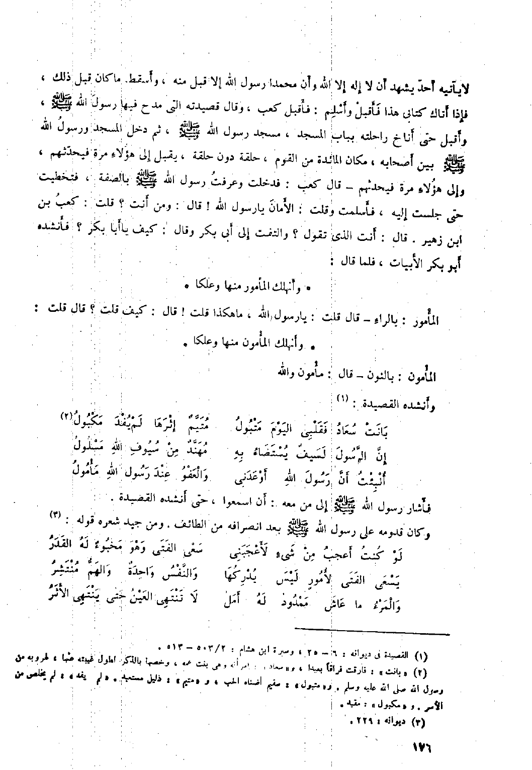 لا يأتيه أحد يَشْهَدُ أَنَّ لا إِلَهَ إِلا اللَّهُ وَأَنَّ محمدا رَسُول اللَّه إلا قبل مِنْهُ، وأسقط ما كَانَ قبل ذَلِكَ، فإذا أتاك كتابي هَذَا فأقبل وأسلم: فأقبل كعب، وقَالَ قصيدته التي مدح فيها رَسُول الله صلّى الله عليه وآله وَسَلَّمَ، وأقبل حتَّى أناخ راحلته بباب المسجد، مسجد رسول الله صلّى الله عليه وآله وَسَلَّمَ، ثُمَّ دخل المسجد ورسول اللَّه صَلَّى الله عليه وآله وَسَلَّمَ بين أصحابه، مكان المائدة من القوم، حلقة دون حلقة، يقبل إِلَى هَؤُلَاءِ مرة فيحدثهم، وَإِلى هَؤُلَاءِ مرة فيحدثهم- قَالَ كعب: فدخلت وعرفت رسول الله صلّى الله عليه وآله وَسَلَّمَ بالصفة، فتخطيت حتَّى جلست إِلَيْه، فأسلمت وقلت: الأمان يا رَسُول اللَّه! قَالَ: ومن أنت؟ قلت: كعب بن ابن زُهَيْر. قَالَ: أنت الَّذِي تَقُولُ؟ والتفت إِلَى أَبِي بَكْر وقَالَ: كيف يا أبا بَكْر؟ فأنشده أَبُو بَكْر الأبيات، فلما قَالَ: