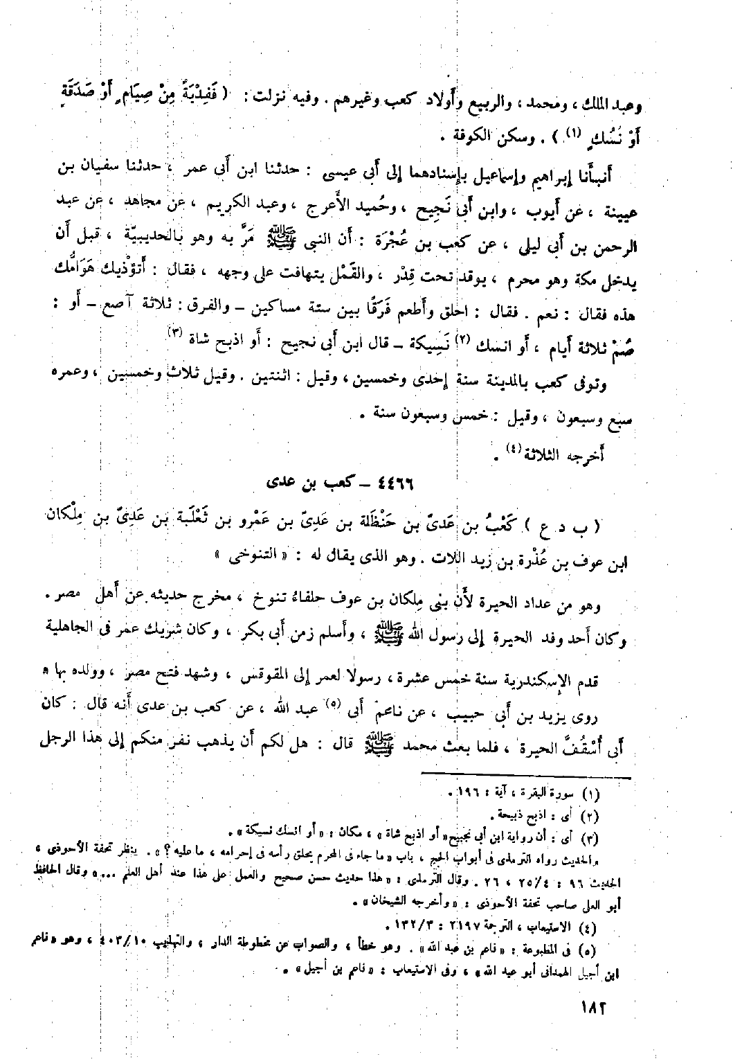 وعبد الملك، ومحمد، والربيع وأولاد كعب وغيرهم. وفيه نزلت: فَفِدْيَةٌ مِنْ صِيامٍ أَوْ صَدَقَةٍ أَوْ نُسُكٍ [١] ٢: ١٩٦. وسكن الكوفة.