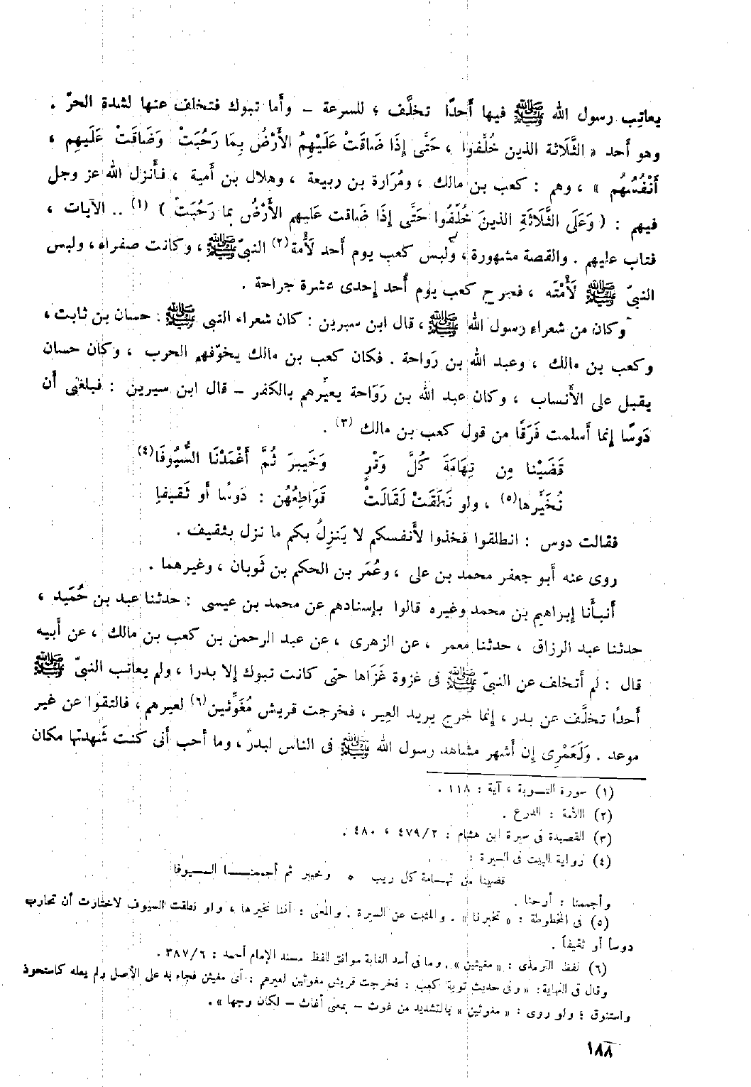 أَنْبَأَنَا إِبْرَاهِيمُ بْنُ مُحَمَّدٍ وَغَيْرُهُ قَالُوا بِإِسْنَادِهِمْ عَنْ مُحَمَّدِ بْنِ عِيسَى: حدثنا عَبْدُ بْن حُمَيْدٍ، حَدَّثَنَا عَبْدُ الرَّزَّاقِ، حَدَّثَنَا مَعْمَرٌ، عَنِ الزُّهْرِيّ، عَنْ عَبْدِ الرَّحْمَنِ بْن كَعْبِ بْنِ مَالِكٍ، عَنْ أَبِيهِ قَالَ: لَمْ أتخلف عن النبيّ صلّى الله عليه وآله وَسَلَّمَ فِي غَزْوَةٍ غَزَاهَا حَتَّى كَانَتْ تَبُوكُ إِلا بَدْرًا، وَلَمْ يُعَاتِبِ النَّبِيُّ صَلَّى اللَّهُ عليه وآله وَسَلَّمَ أَحَدًا تَخَلَّفَ عَنْ بَدْرٍ، إِنَّمَا خَرَجَ يُرِيدُ الْعِيرَ، فَخَرَجَتْ قُرَيْشٌ مُغْوِثِينَ [٦] لِعِيرِهِمْ، فَالْتَقَوْا عَنْ غَيْرِ مَوْعِدٍ. وَلَعَمْرِي إِنَّ أَشْهَرَ مَشَاهِدِ رسول الله صلى الله عليه وسلم في النَّاسِ لَبَدْرٌ، وَمَا أُحِبُّ أَنِّي كُنْتُ شَهِدْتُهَا مكان