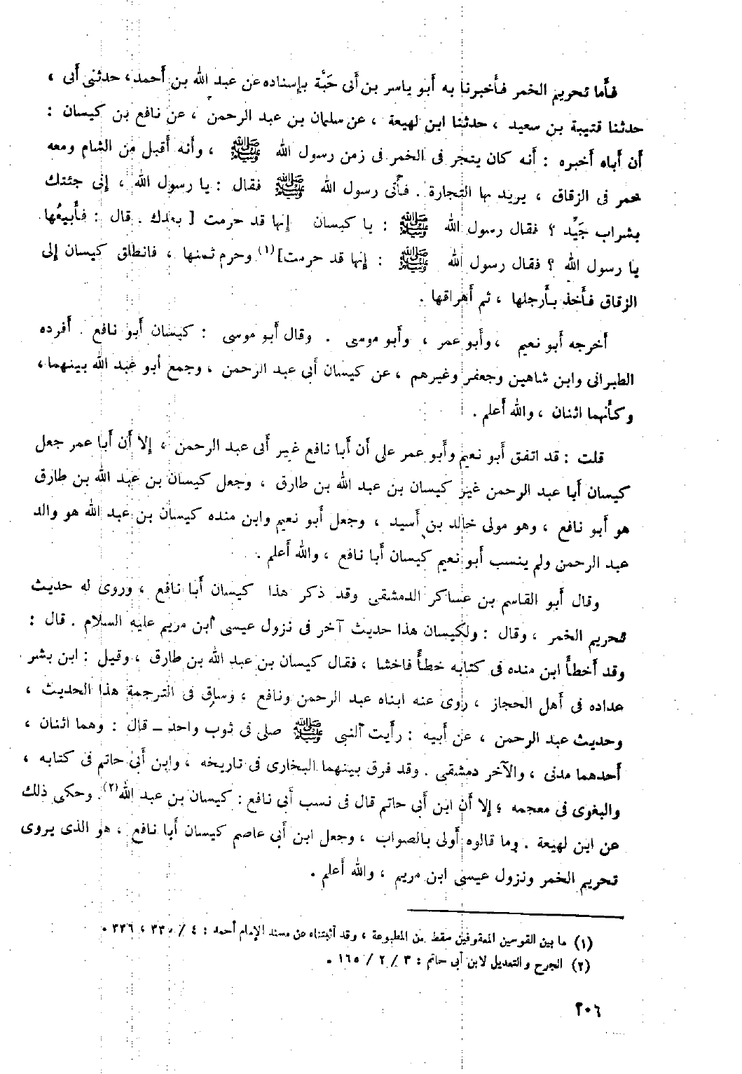 فأمَّا تحريم الخمر فَأَخْبَرَنَا بِهِ أَبُو يَاسِرِ بْنُ أَبِي حَبَّةَ بِإِسْنَادِهِ عن عبد الله بْنِ أَحْمَدَ، حَدَّثَنِي أَبِي، حَدَّثَنَا قُتَيْبَةُ بْنُ سعيد، حدثنا ابن لهيعة، عن سلمان بْنِ عَبْدِ الرَّحْمَنِ، عَنْ نَافِعِ بْنِ كَيْسَانَ: