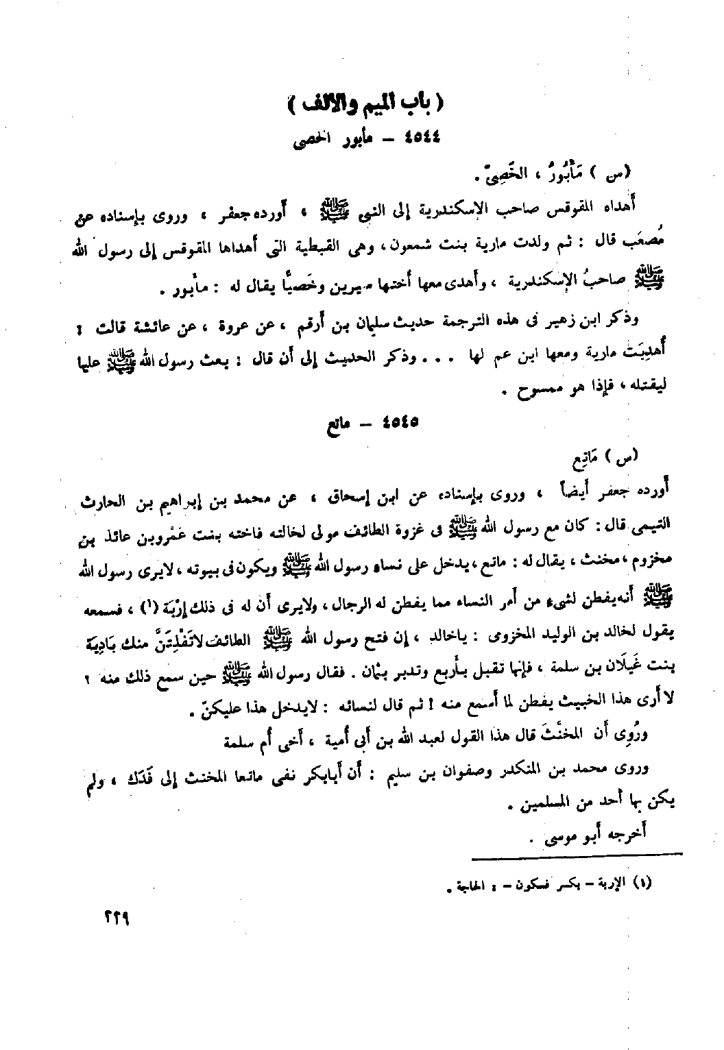 أهداه المقوقس صاحب الإسكندرية إلى النبي صلّى الله عليه وآله وسلم، أورده جَعْفَر، وروى بِإِسْنَادِهِ عَنْ مُصعَب قَالَ: ثُمَّ ولدت مارية بنت شمعون، وهي القبطية التي أهداها المقوقس إِلَى رَسُول اللَّهِ صلّى الله عليه وآله وسلم صاحبُ الإسكندرية، وأهدى معها أختها سيرين وخصيَّاً يقال لَهُ: مأبور.
