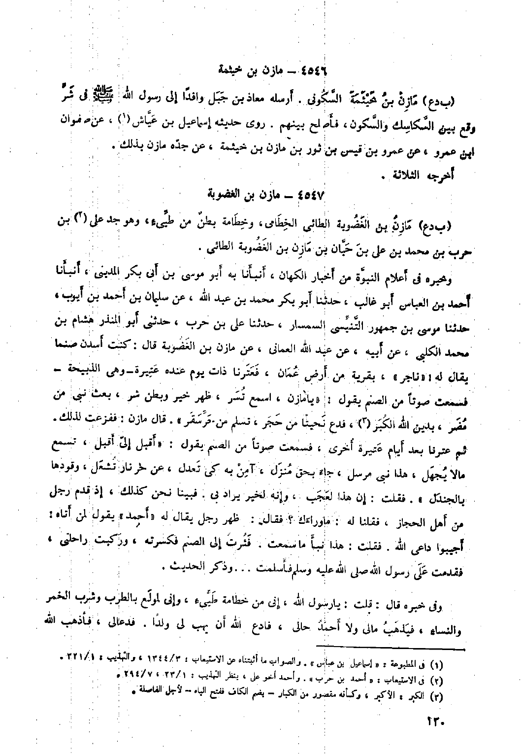 وخبره فِي أعلام النبوَّة من أخبار الكهان، أنبأنا به أبو موسى بن أَبِي بَكْرٍ الْمَدِينِيُّ، أَنْبَأَنَا أَحْمَدُ بْنُ الْعَبَّاسِ أبو غالب، حَدَّثَنَا أَبُو بَكْرٍ مُحَمَّدُ بْنُ عَبْدِ اللَّهِ، عَنْ سُلَيْمَانَ بْنِ أَحْمَدَ بْنِ أَيُّوبَ، حَدَّثَنَا مُوسَى بْنُ جُمْهُورٍ التِّنِّيسِيُّ السِّمْسَارُ، حَدَّثَنَا عَليُّ بْنُ حَرْبٍ، حَدَّثَنِي أَبُو الْمُنْذِرِ هِشَامُ بْنُ مُحَمَّدٍ الْكَلْبِيُّ، عَنْ أَبِيهِ، عَنْ عَبْدِ اللَّهِ الْعُمَانِيِّ، عَنْ مَازِنِ بْنِ الْغَضُوبَةِ قَالَ: كُنْتُ أَسْدُنُ صَنَمًا يُقَالُ لَهُ: «نَاجِرٍ» ، بِقَرْيَةٍ مِنْ أَرْضِ عُمَانَ، فَعَتَرْنَا ذَاتَ يَوْمٍ عِنْدَهُ عَتِيرَةً- وَهِيَ الذَّبِيحَةُ- فَسَمِعْتُ صَوْتًا مِنَ الصَّنَمِ يَقُولُ: «يَا مَازِنُ، اسْمَعْ تُسَرْ، ظَهَرَ خَيْرٌ وَبَطَنَ شَرْ، بُعِثَ نَبِيٌّ مِنْ مُضَرْ، بِدِينِ اللَّهِ الْكُبَرْ [٣] ، فَدَعْ نَحِيتًا مِنْ حَجَرْ، تَسْلَمْ مِنْ حَرِّ سَقَرْ» . قَالَ مَازِنٌ: فَفَزِعْتُ لِذَلِكَ.